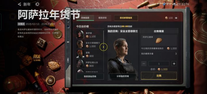 三角洲行动【CJ36SXZT】我今天的货商【安全主管德穆兰】出价【1,000】拜年币,复制口令来一起发财!-02月20日