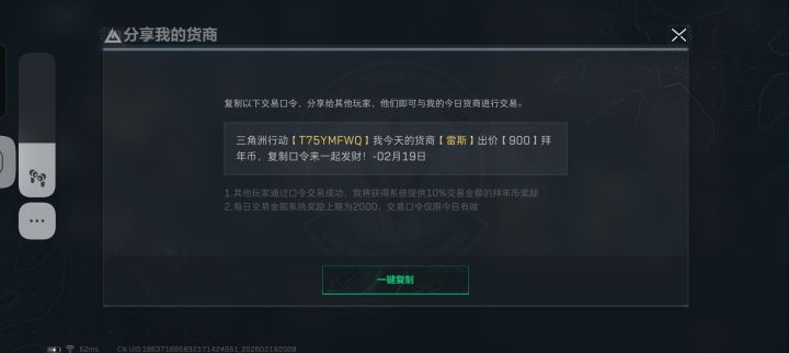 三角洲行动【T75YMFWQ】我今天的货商【雷斯】出价【900】拜年币,复制口令来一起发财!-02月19日#三角洲行动