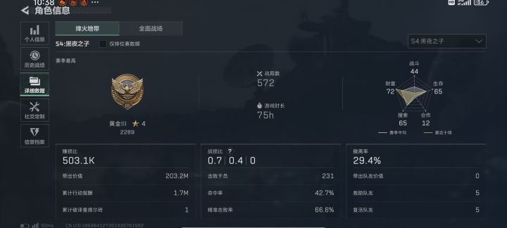 如图所示我这号想爆小红大红已经不是啥难事了,那我就斗胆为各位跑刀鼠鼠提供一点养号思路,希望可以帮到你们。账号为正常起号,kd为1~2之间千万不要尝试鸡爪流,菩萨流,也不要威龙丢包撤。这样极容易被系统判定你没在认真玩,立马就丢到小黑屋里面吃不到东西还给猛攻哥当路边一条踹死。下面就是养号思路(前提不是黑屋号,鸡爪号,是正常开局)1、首先降kd,撤离率。将数值控制在kd:0.5~1,撤