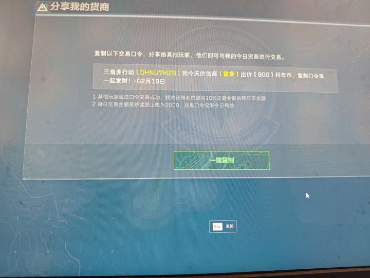 三角洲行动【K9AVCV6A】我今天的货商【雷斯】出价【900】拜年币,复制口令来一起发财!-02月19日