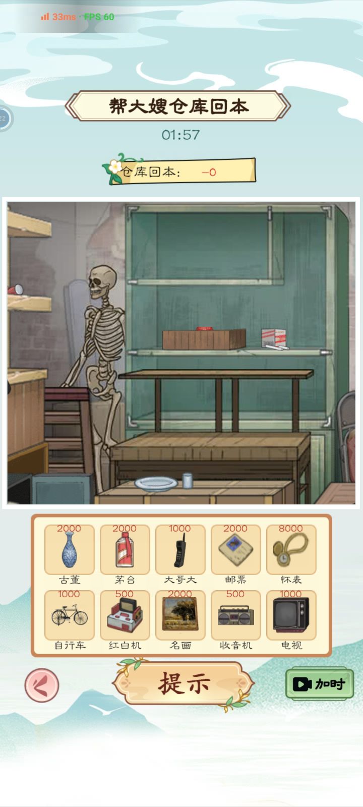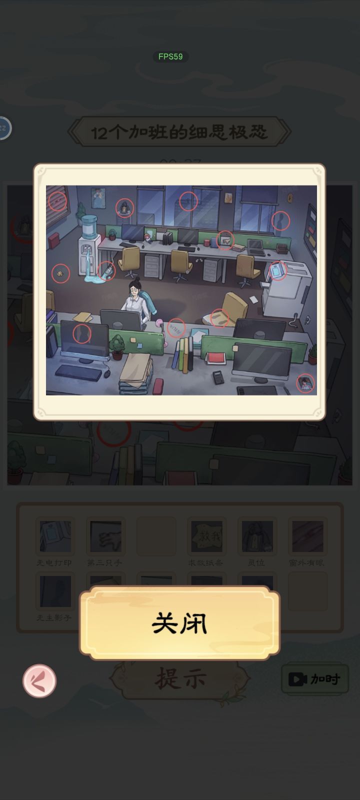 要不是眼睛厉害一点 不一定能找得到呢 他还有提示 用看视频的方式获取提示 考验眼力的时候 这个时候一定要睁大双眼反应要快一点 因为有时间限制的 其实也挺开发左右脑的 整体来说比较不错 我喜欢玩恐怖刺激的游戏 就比如第1节 办公室加班 有好几处都没找到还得靠提示 慢慢玩仔细观察👀就能洞悉一切