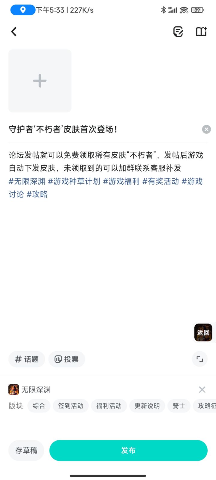 论坛发帖就可以免费领取稀有皮肤“不朽者”,发帖后游戏自动下发皮肤,未领取到的可以加群联系客服补发 #无限深渊 #游戏种草计划 #游戏福利 #有奖活动 #游戏讨论 #攻略