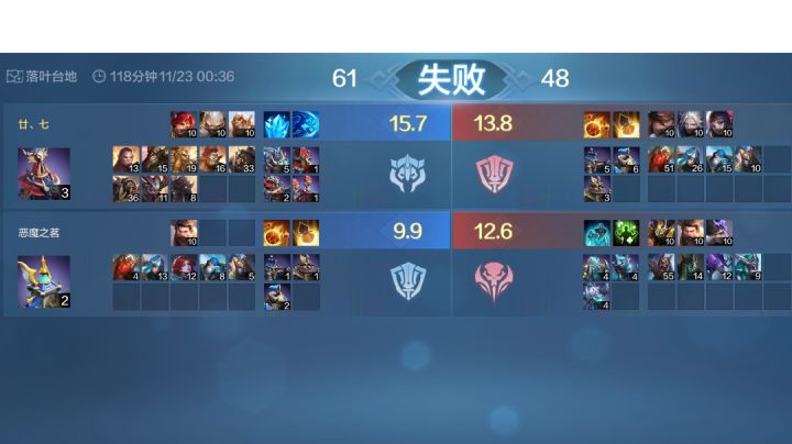 118分钟,你晶矿也不占 英雄也不召唤 打架还不帮忙 你来干嘛? 下载游戏不要流量 打了近两个小时不要电量 多睡两个小时它不香嘛?基本上是在三打六 偶尔四打六 他就一直送人头 打到最后三个英雄在硬抗 没有晶矿 连个兵都没有 第一次搞到这种地步 连个兵都没有 偷偷摸摸出门刷野怪补晶矿 十次有八次被抓 真的要被气死 技不如人咱拜下风 被拖后腿就很无奈啊啊啊啊