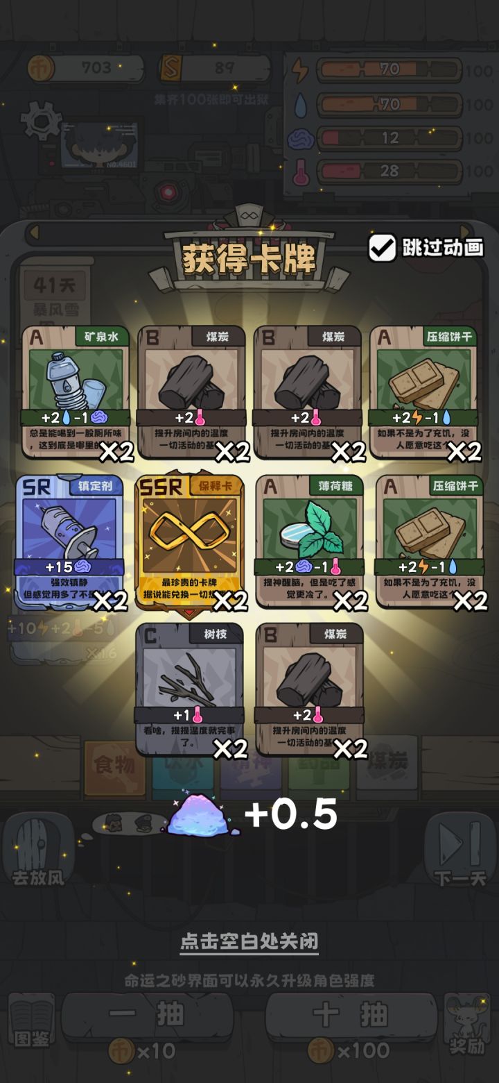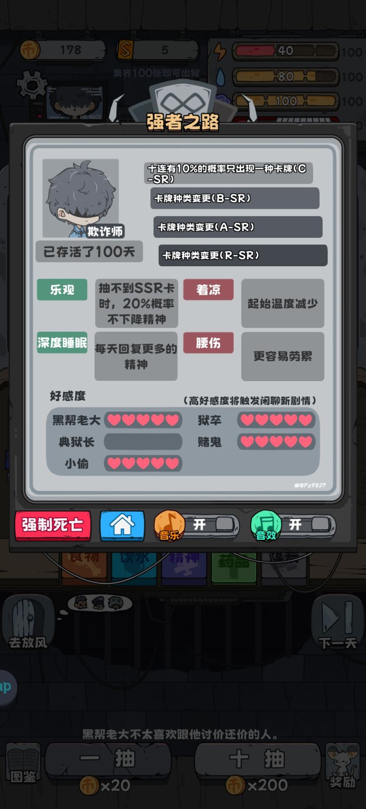 1.先看三个广告开畅玩卡,欺诈师,催眠师。(好像是bug,200砂平时几十个广告都凑不出来)。欺诈师进游戏,天赋随意,直接跳过到第五天和典狱长借900,抽光,五天后典狱长要债选一张不还。关9天出来,你又可以薅典狱长羊毛,注意SSR不要超过10张,会自动还款。SSR多了借给赌鬼,狱警次日跑来告诉你赌鬼出狱,点赌鬼留在位置上的信,达成活菩萨成就。赌鬼跑路之后SSR去交换,交换什么无所谓,只要一直老赖就
