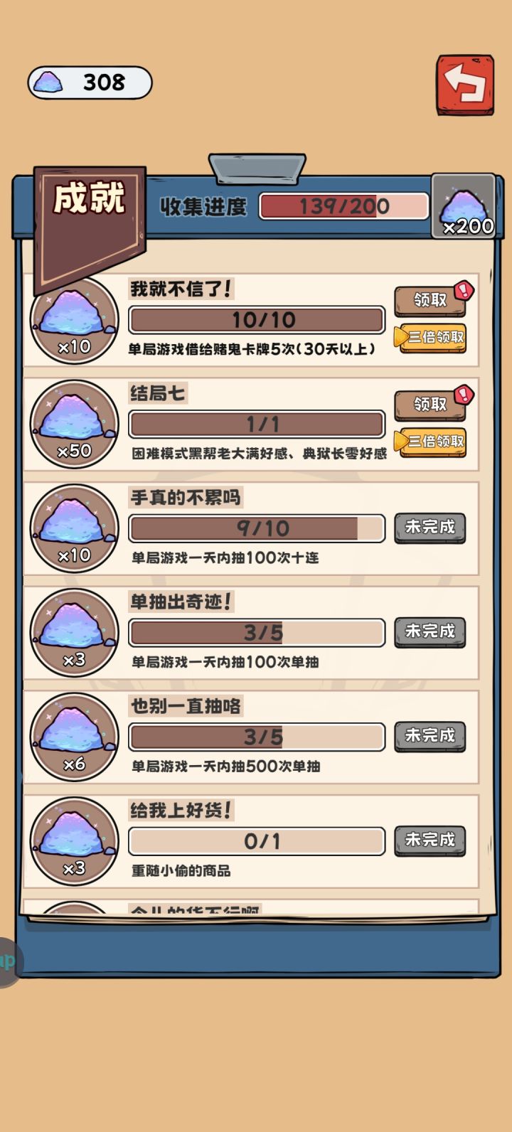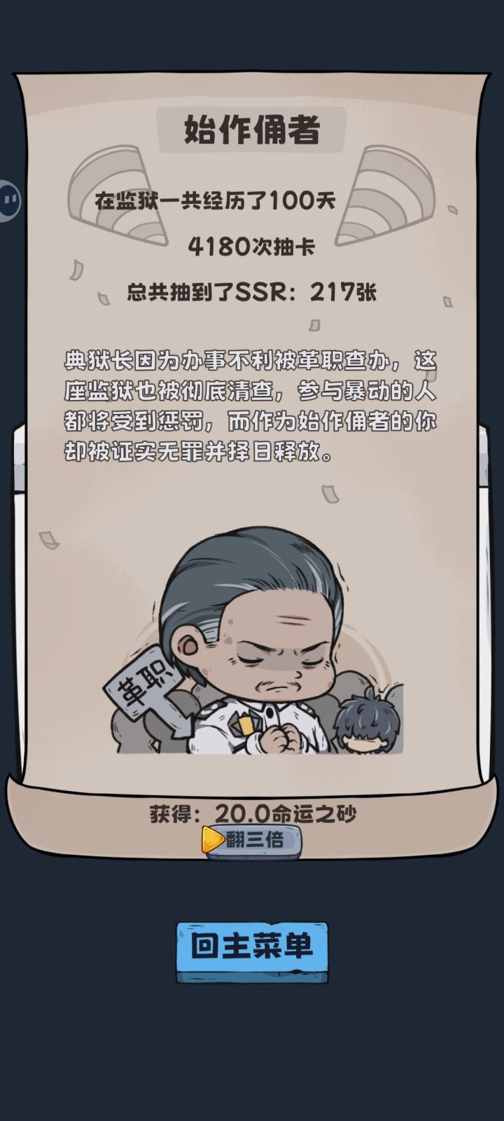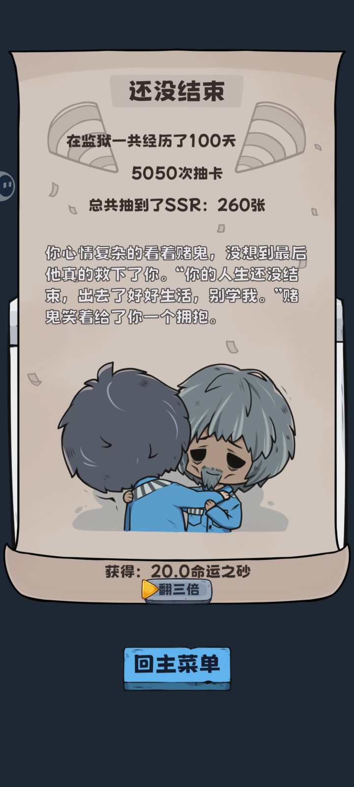 二编:小偷出现次数疑似和身上持有ssr数量挂钩,之前我都是选择第一时间把ssr出手了,这次ssr卡在70~99成功把结局7过了。本来是打算一直刷结局7的,但是每次抽到恶魔福报,小偷出现次数都不足10次导致一直刷不满好感,导致触发三次内鬼结局,目前也没成功刷完结局7建议同时在刷结局7结局8的留一手黑帮老大好感,等其他角色(小偷,赌鬼,黑帮老大小弟,狱卒)好感满值,监狱长好感0,再刷满黑帮老大好感