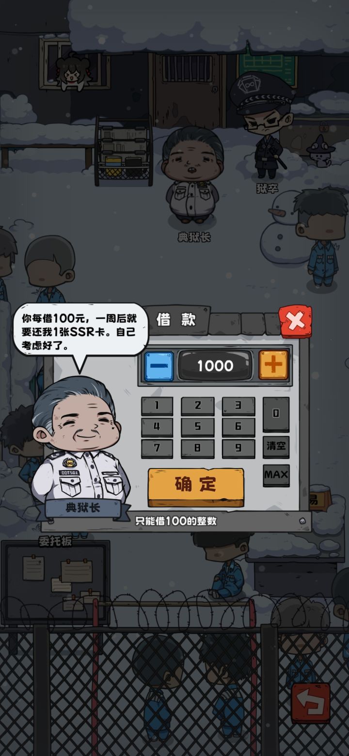 我自己常用的一套玩法,挺快就能出狱的,每天基本都能入五张SSR卡,黑帮老大+杰哥(抽的SSR还不包括在里面),简直不要太爽。先来第一张截图,第十天就38张SSR卡了。这个玩法主要是靠每周一找典狱长贷款(如图2),不用犹豫,直接拉满(借1000),这个贷款简直就是白嫖。接下来就是狂抽(注意san值),抽到SSR就看广告双倍领取然后接下来就是屯最主要的物资:镇定剂和抗感染药,其他的卡贼多,根本
