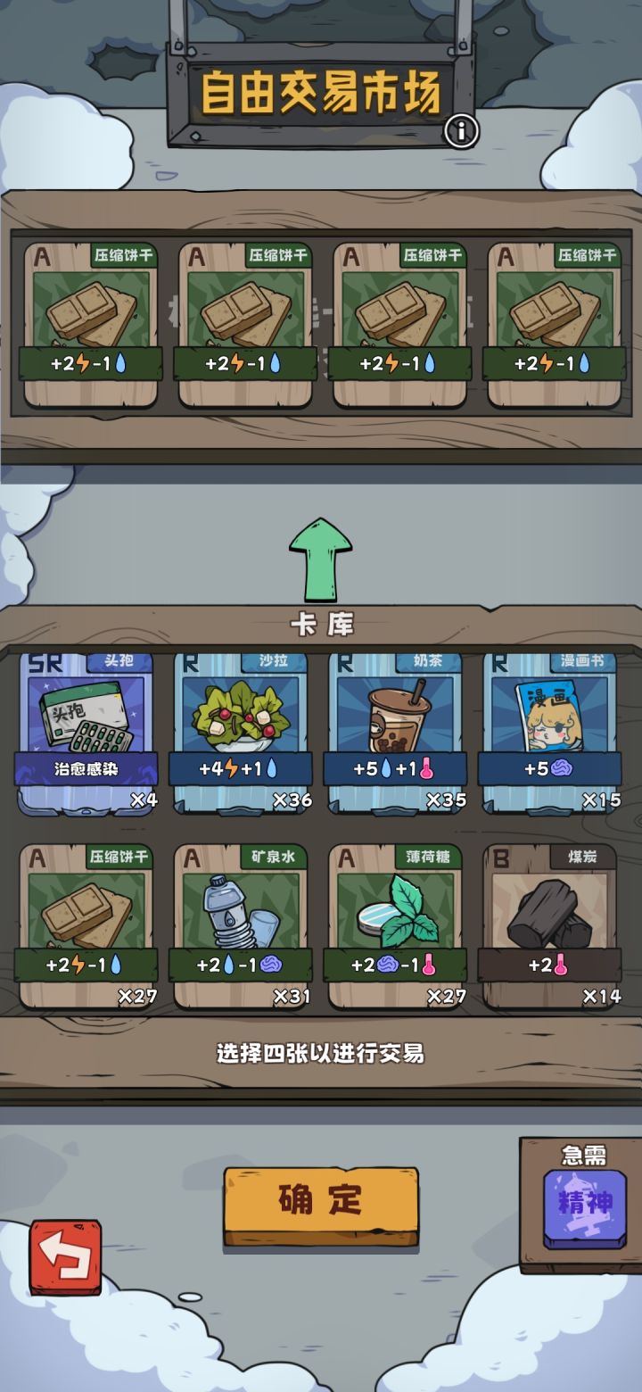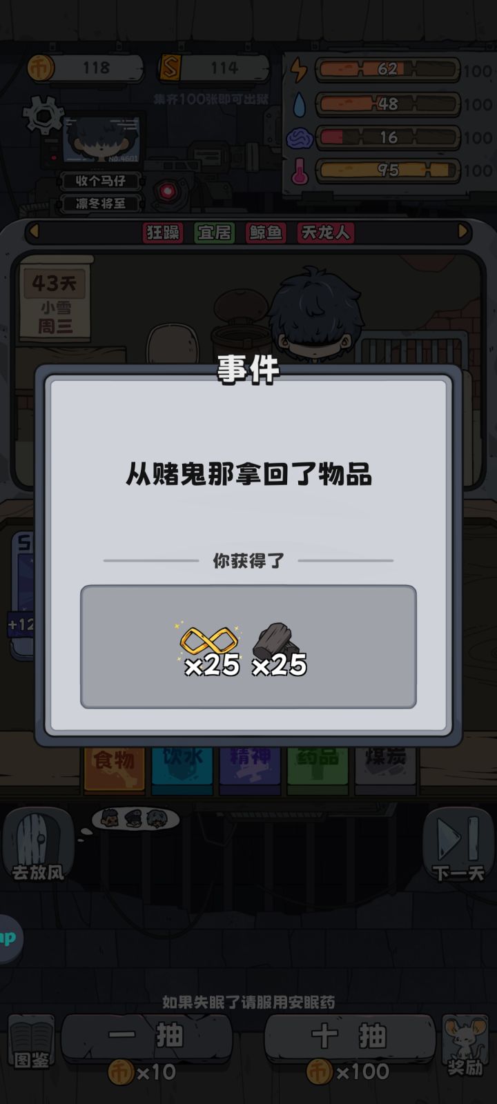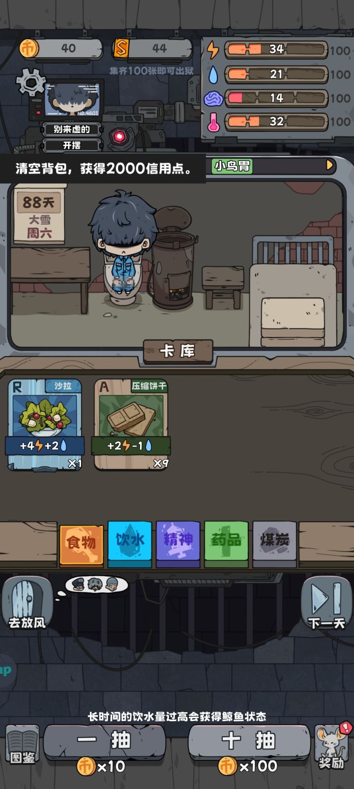 前期通关攻略(典狱长路线)教大家如何第一次就通关正面必选谨慎天赋,负面天赋看情况,不要选让精神期望线变高,不要选温度消耗多(自裁之后重新开始能刷新天赋)首先选小偷进入游戏注意右下角奖励还是挺好的偷到4天之后抽卡看看有没有能换的,这有一个较低概率亏本就是先看看自己有没有的换能换的话先打开一组四个,看看有没有2张SR没的话就去选对面那组(看见小偷就要交易,很小概率会亏本)接下来