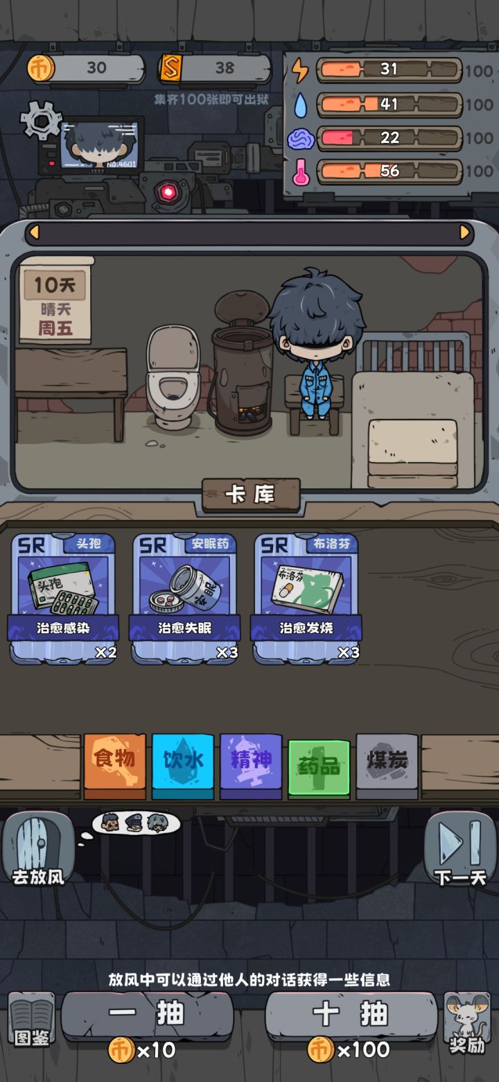 进去后基本前几天就是抽奖。等几天,典狱长来了,直接借款拉满,然后开抽。抽到的A卡全部拿去交易换卡,记得需求表明精神,然后只要有sr就拿。每天抽卡保持40抽一下避免上瘾debuff。等卡抽完了,拿多余的sr卡去交易换,只要出ssr就换,不用管其余卡。保持精通到期望线以上,80—90左右,会有充沛,砍价能多砍一刀,这样可以5或7木头找监狱头子换一张ssr,七天就是七张。基本只要你七天的17