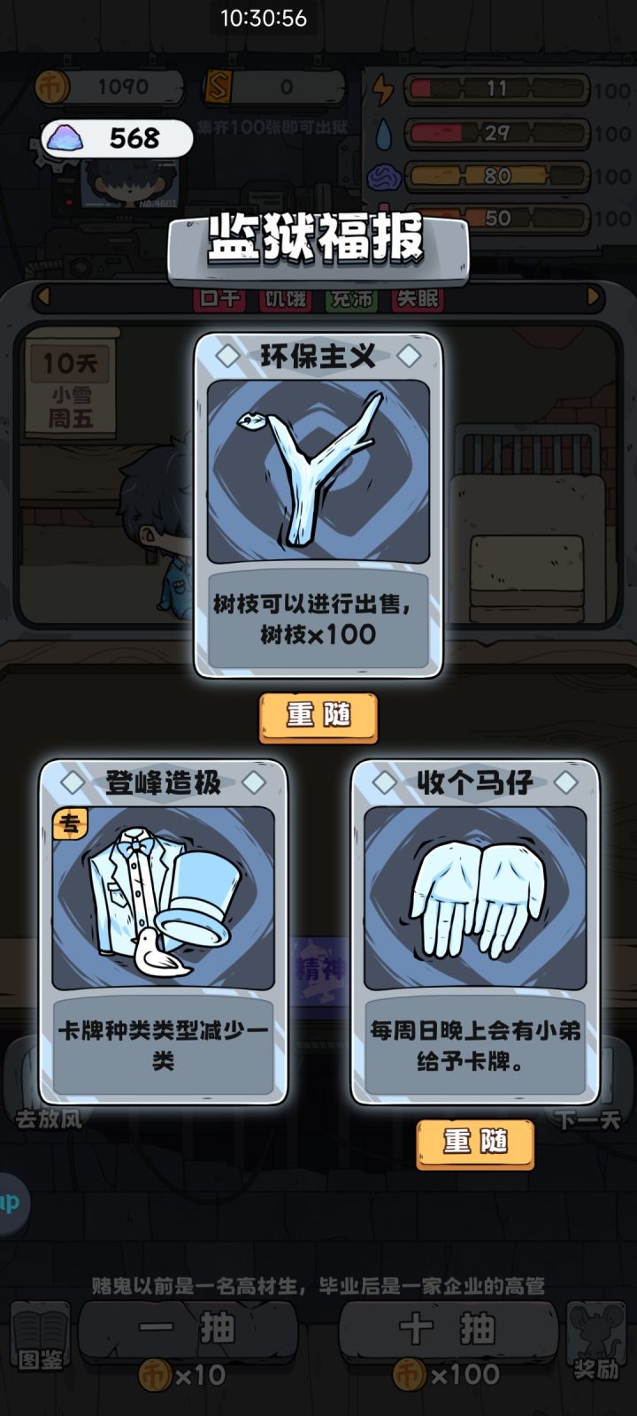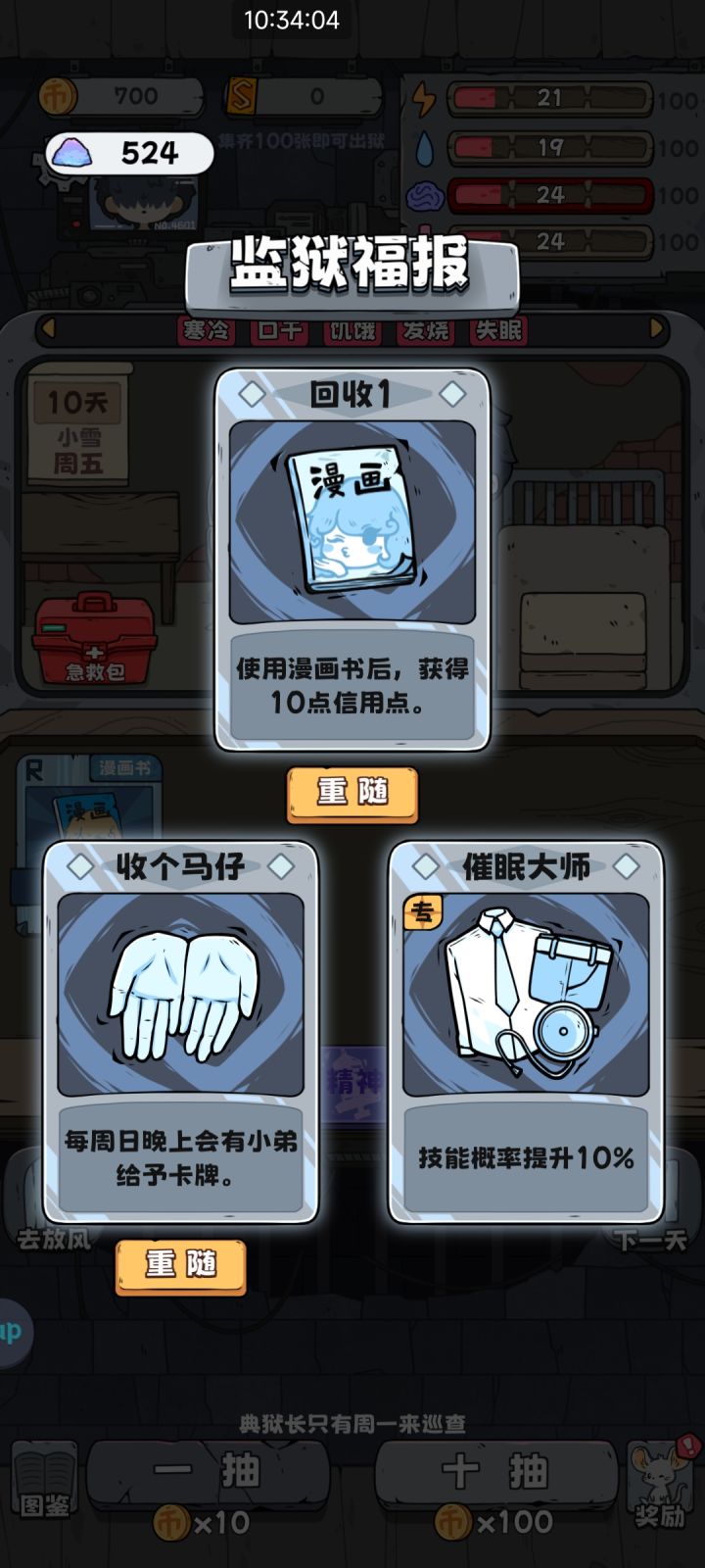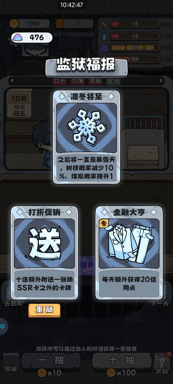 典狱长这个路线后期集卡特别轻松。在每周周一的时候,典狱长会来到监狱,这个时候玩家可以朝典狱长借钱,每次借1000元,然后到周六的时候还给典狱长十张SSR卡(刚开局推荐攒5张以上SSR再借,千万别还不起),周六还完款之后会增加20好感(一颗心),等到满好感(五颗心)之后,触发对话,选择答应典狱长,然后一百天结束如果集不齐SSR卡典狱长会捞你。(一定得活到100天)在达成这个目标之后就会感觉很轻松