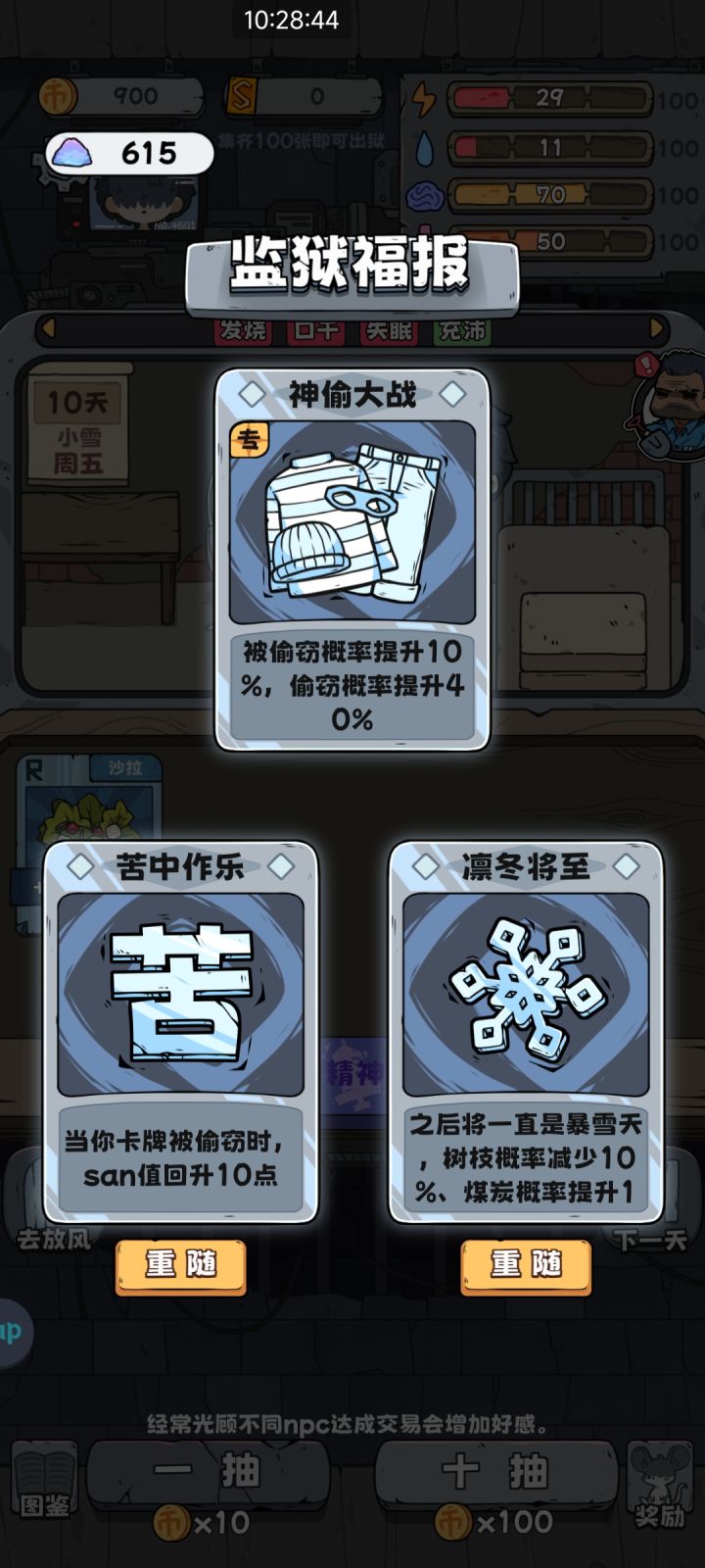 起因是我跟典狱长借了1000,然后疯狂抽卡。得了110+煤炭,黑帮老大那里换不完,黑帮老大的小弟还给我送煤炭。我一气之下放4张煤炭交易,结果他来了——啊杰,就在这时候出现了,我每每放4个煤炭,他每每都来给我SSR,最多一天能换到啊杰12张SSR。然后问题就来了,大概在25天的时候,我的SSR就濒临100大关,我就快出狱了,可是不行,我还想呆100天,牢里有吃有喝还有狱友,我怎么能提前出去。于