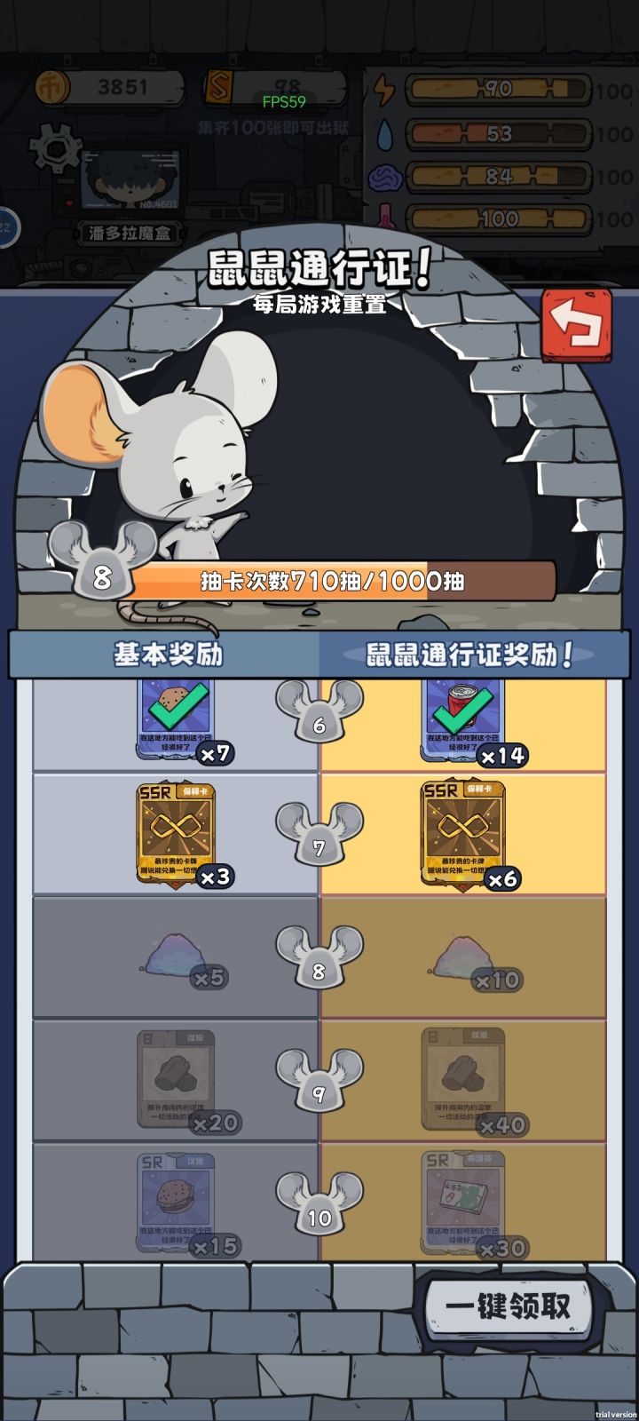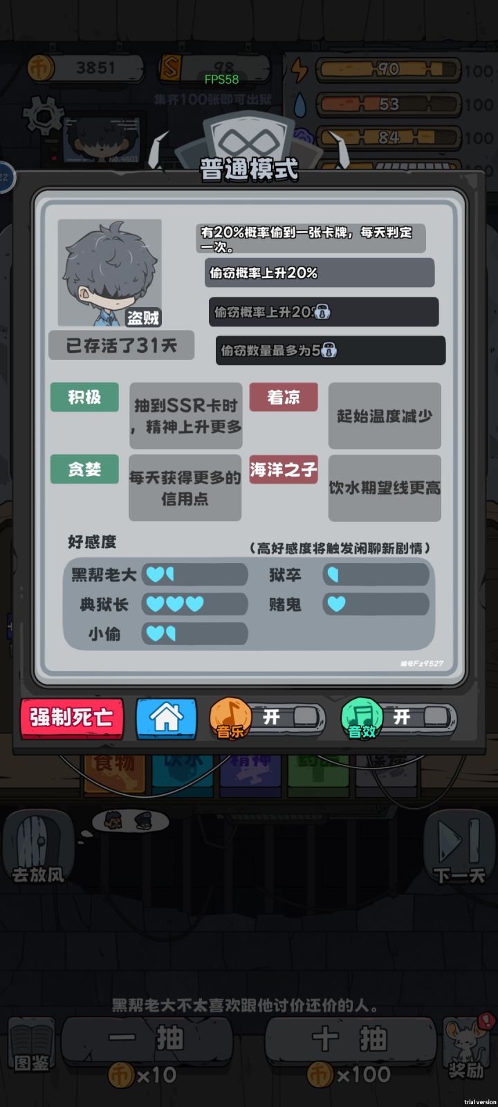 小偷职业升了2级,卡牌升级可以忽略不计。流程是和监狱长借钱借满,去黑帮老大那里买点卡,再去狱卒那里卖,88天终于抽满5000次了。玩的是普通局,两个福利分别是20张SSR和2000信用点。通行证里面的SSR先别着急点,如果还不上监狱长的话再去点,太早点SSR就抽不满5000次。卡差的很多就可以去找一下杰哥,提前准备好一盒头孢和两支镇定剂,感染率高于10的话就很容易感染。#抽卡监狱 #游戏