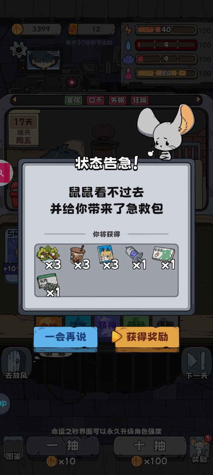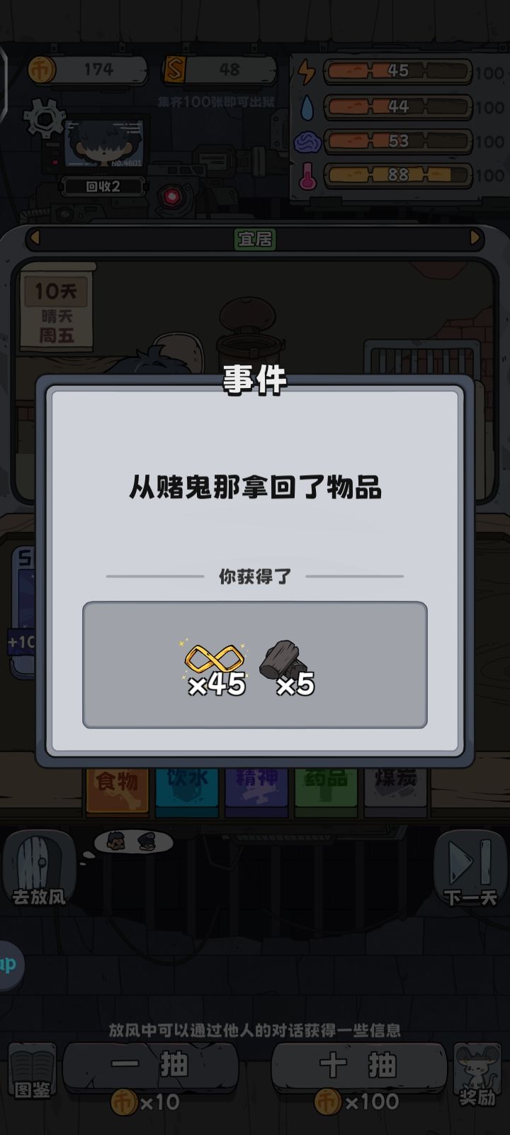 角色:小偷等级:二级卡牌升级:小部分满级天赋:看着选开局:建议激活通行证不吃不喝持续偷牌第六天典狱长出现1000元拉满开始抽卡抽完补好状态(四维至少75以上)然后去黑帮老大那换一些SR的牌(后期碳多可以全换)去狱卒那卖掉剩余的牌建议每种药品保留至少2个(不留容易寄)卖完继续抽牌中期:小偷:来了就换(较大概率赚)赌徒:如果不是刷成就,就不要给他牌狱卒:抽完牌