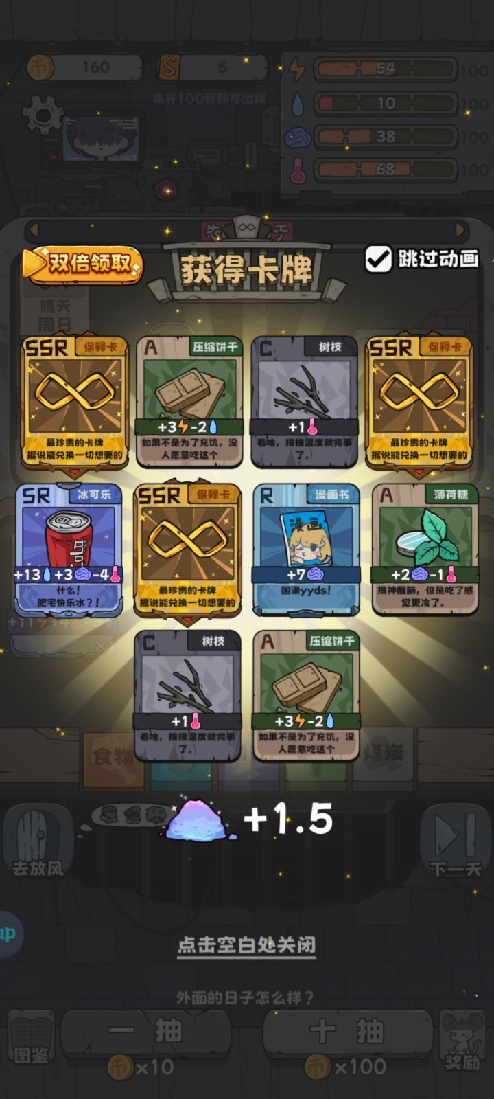 一直抽卡就会发现食物那些是不缺的,吃奶茶和沙拉就行,汉堡可乐和其他药都留着每天看看狱卒,价格高就卖掉,低就留。前期缺什么就去换。然后一直交换抽卡小偷等木头够,中间典狱长在卡够的时候就可以全拉满,木头够了之后等暴风雪,黑老大的兑换价格就会到最低,这时候你拉满保释卡加精神俩格的充沛多砍一刀就能直接换够保释卡了。(这里可以先点满保释卡砍俩刀看具体差多少好去换木头)