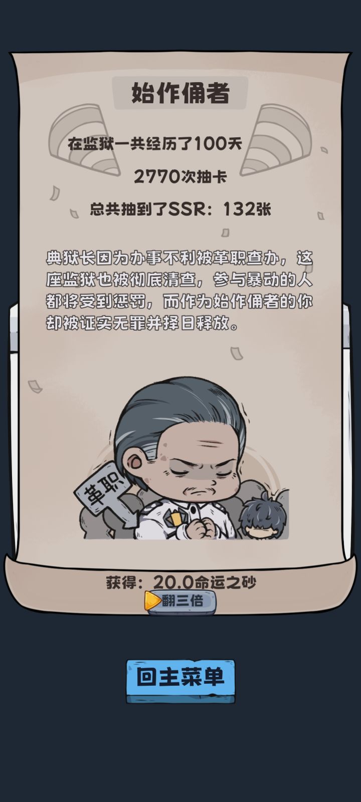 第一次典狱长的时候可以少交点费用,200-300这样的话交的上或者直接拉满,然后食物饥饿保持低一点直接坐牢恢复满,中途就一直拿木头去赌,大概300左右的样子就差不多够了,然后饥饿温度水保持第一格不掉状态就行,精神恢复上俩格有个充沛,可以多砍一刀pdd,这样交易遇到杰哥也能换卡不怕掉精神。
