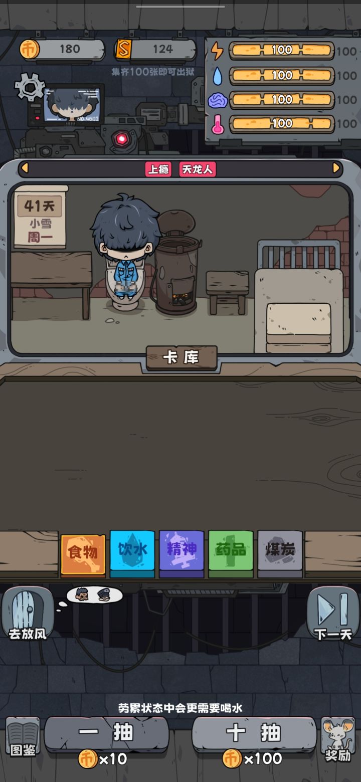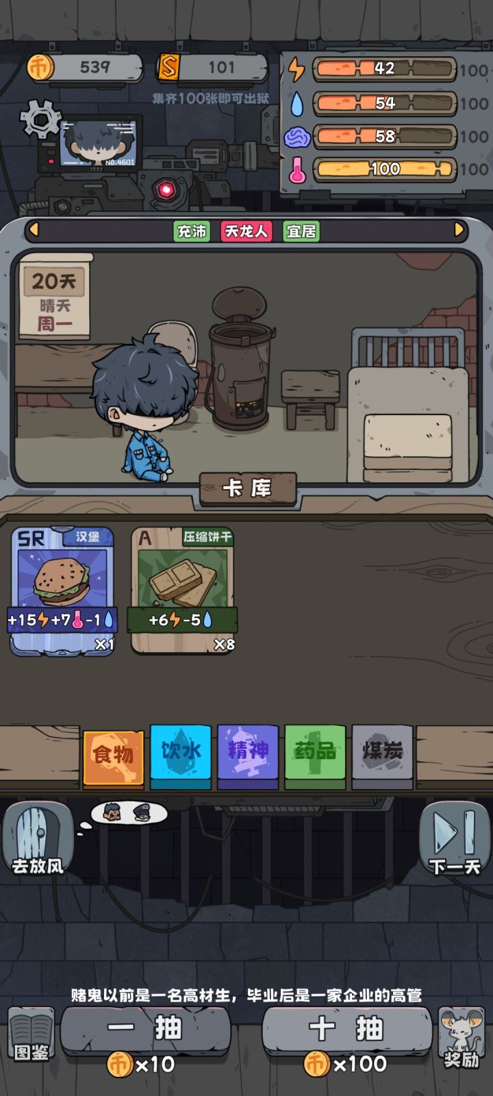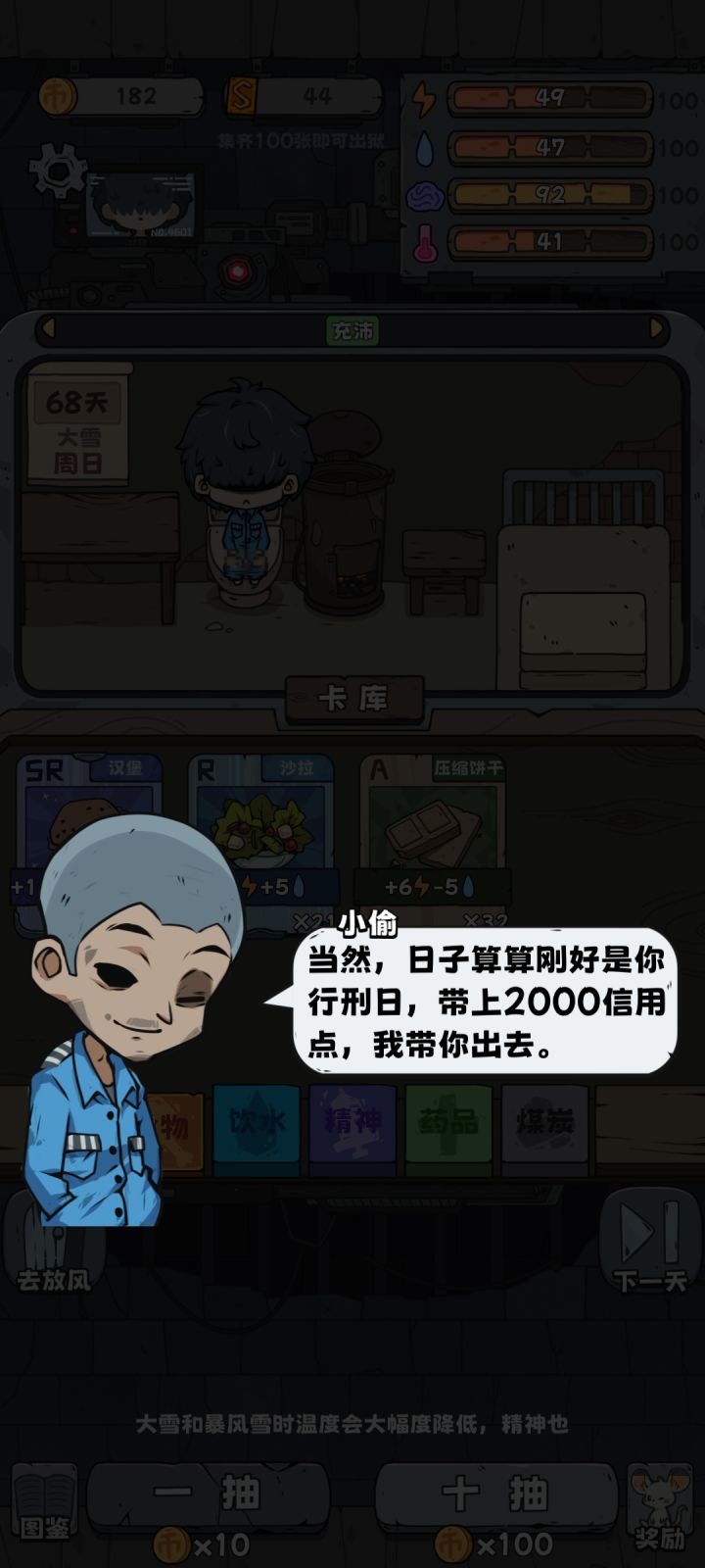很简单,就是卖了抽,抽了卖,ssr卡不要留着,每抽三张交易走两张留一张这样。一个ssr卡三个煤可以换2个sr,或者四个r这样子,大概是50块的价值。 如果想效率高一些,要刷刷开局,抽sr加精神的天赋,鼻塞。然后看狱警那里的市场价格,(第一天通关不能刷新物价),随机出物价升值(也就是箭头)的越多循环越容易。要知道这可是永动机,每次循环卖出去多一块钱,循环一百次就多了十连抽。 然后精神要精打细算,最好用薄荷加小树枝增温。因为薄荷最便宜。(7精6块,对比漫画10精14,打针20精23) 然后如果不嫌手疼,可以拿四个木炭去换,大概率一个r三个树枝,这是赚的(3x4 小于14),小概率遇到杰哥,扣30精换四个ssr 这个攻略只适合当前版本,万一策划调整概率,可能就没法永动了。