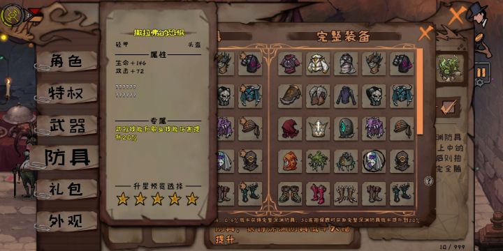 闲的无聊首先要了解,三种甲的加成(满级天赋)重甲是10%的伤害减免和15%生命 侧重生命,攻击较低轻甲是10%的攻速和15%移速 属性均衡法衣是10伤害加成和15%精力 侧重攻击,生命较低我个人觉得轻甲第一,重甲第二,法衣第三,所以我推荐的不会有太多的法衣套。(深渊防具,我都是默认轻甲)头盔类 轻甲撒拉弗的恐惧(技能头) 推荐技能头是比较通用的,像蝙蝠这样靠技能输出的可以有很大的增