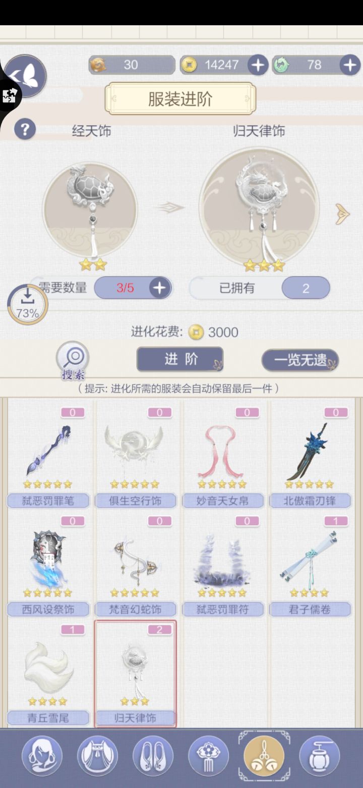 20200513 20:00就在5分钟前。我合成了两个经天饰,加上原来的三个就可以进阶成一个归天律饰。这样我就能有3个归天律。可是合成后的数据没有更新。羽毛少了60,体力也少了,买金币的祈玉也少了35个大家有遇到过这种情况吗??