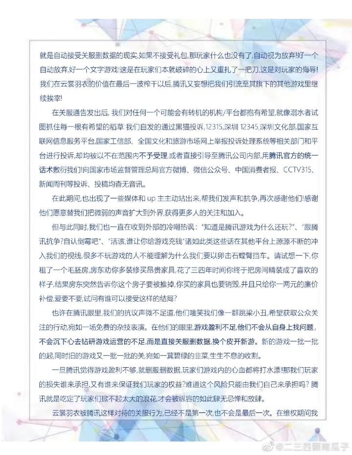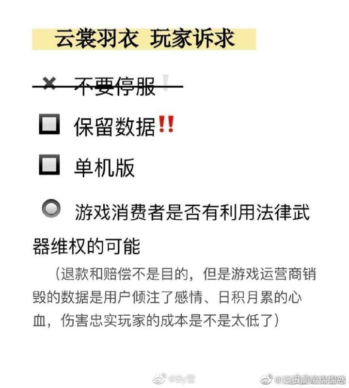 ❗请正视云裳羽衣玩家诉求❗ ⭕保存游戏数据改不盈利单机⭕ 💢不然以后谁敢玩tx的游戏,永远不要和资本家共情,不过是韭菜罢了,连游戏账号都不是我们自己的,可那是我们用心血和时光一点点养出来的女儿,凭什么剥夺我们留下她的权利,非要挫骨扬灰吗?这就是tx的本质,如果不留下我们的数据,以后谁敢玩你们的游戏?@腾讯游戏 💢退钱单机二选一!!!退钱单机二选一!!!退钱单机二选一!!!退钱单机二选一!!!退钱单