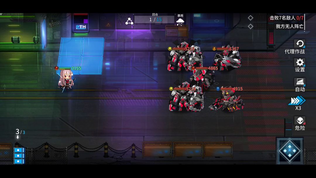 给大家介绍两个机制。一个是5-15boss的,这个boss有个召唤触手的技能,两回合一次,触手存在的时候本体免伤90%。至于什么激光落石,都算是技能。再一个是洛珈的,洛珈一技能每次命中会附带一层弱电,3层弱电会转化为麻痹,麻痹的时候不能放技能。那么接下来讲解思路。只要创造出和boss单挑的状况,洛珈就可以用3次一技能直接让boss永远放不出触手。然后再用自身2点的移动力恰好逃离boss的攻
