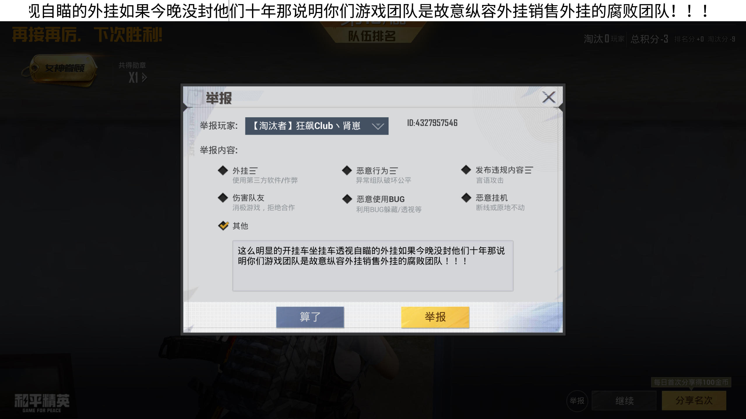 2023 2.16 晚上 凌晨1:33 距离被封号已经过去2年 事情的经过回到2021年12月份 我在跟宿友玩吃鸡 因为我以前都是一个人(s1刺激战场老玩家)然后上到大学之前 断断续续的回归这个游戏 在大学也是如此 前后也是氪了几套衣服 当然我还是喜欢刺激战场的小白裙 可是 宿友们很奇怪 每次都是几天玩几把游戏 我每次都要等几天他们上线我才开心的上线跟他们玩那几局吃鸡 可是 就是在12月那个期间 有一天上午 下课去买饭 我就想登录游戏看看 可是 突如其来的封号十年吓到了我 我一看是开挂被封十年 那个时候我前前后后尝试了申述 这种我的号被盗 异地登录 然而 客服却让我深刻的了解到了这个现实社会 ,我知道我只能认了,随后我一直用小号玩这个游戏 可是在2022年期间 我还是不甘心 我不甘心我充钱的号被别人盗 然后我还不能玩 我恨 我不甘 我申述了一次 可还是失败 今天 2023年 2月16号 我在网络上看见这种解封方法 去taptap和平精英分区发帖 客服可以看得见 现在我要以血写书 我不甘 我是一个从刺激战场到和平精英的玩家 s1玩家 我也痛恨开挂玩家 怎会与开挂者为伍! 我的qq 3145077680 电话号码如果官方人员回复 我可以出电话号码 联系 我可以放下一句话 如果我开挂 我就死亡