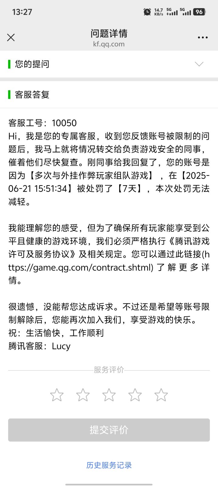 我是从和平精英这款游戏的一个纯绿氪金老玩家,已在该游戏充值消费十万元以上,最痛恨的就是外挂!游戏账号在2025年6月19日竟然被无故封禁了!游戏账号被处罚封禁的当天,我本人没有进行游戏操作,且我确认我没有加载任何违规软件! 电脑是新买的,才用了两个月,竟然把我电脑也封禁了!是腾讯误封了我的账号,2025年6月19日至今已申诉很多次,都回复说我作弊,我非常确认本人在游戏对局中不存在任何作弊的行为,