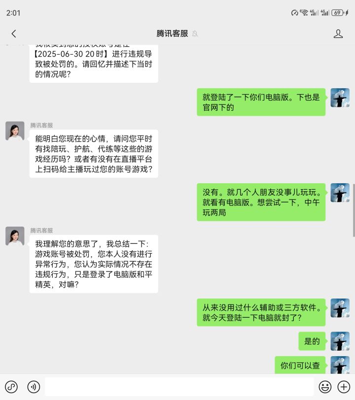 游戏昵称:吥寳数字ID:3405513435账号: TangChaochao1314区服:微信区我是从和平精英这款游戏的一个纯绿氪金老玩家,已在该游戏充值消费十万元以上,最痛恨的就是外挂!游戏账号在2025年6月19日竟然被无故封禁了!游戏账号被处罚封禁的当天,我本人没有进行游戏操作,且我确认我没有加载任何违规软件! 电脑是新买的,才用了两个月,竟然把我电脑也封禁了!是腾讯误封了我的账号