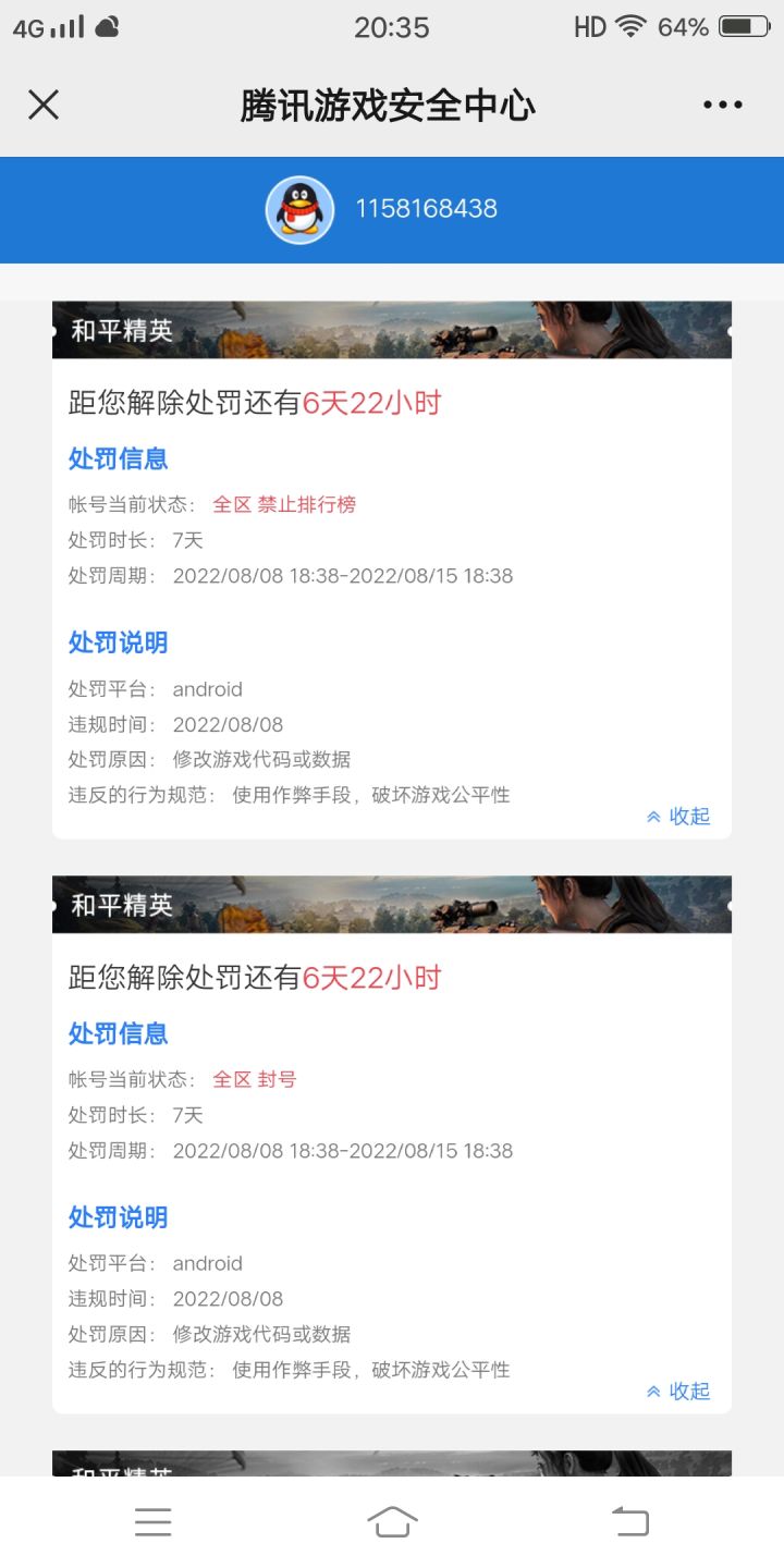 最近一段时间用手机玩,然后转模拟器玩,最近也没干什么,无缘无故被封号了,唯一一个疑点就是手机之前下了个pubgtool的画质助手开了个60帧,不然手机卡,打了两个周,然后今天晚上登号就被封了一周,我也一头雾水,说我修改游戏代码,我也没开挂啊,能不能来个官方解释一下,再复查下我的账号行吗,我还被禁用排行榜一周了,官方帮忙看一下,到底是什么原因造成的或者说是误封,如果误封给解封下,这几天很需要这个号的,求求了,很急,在线等!