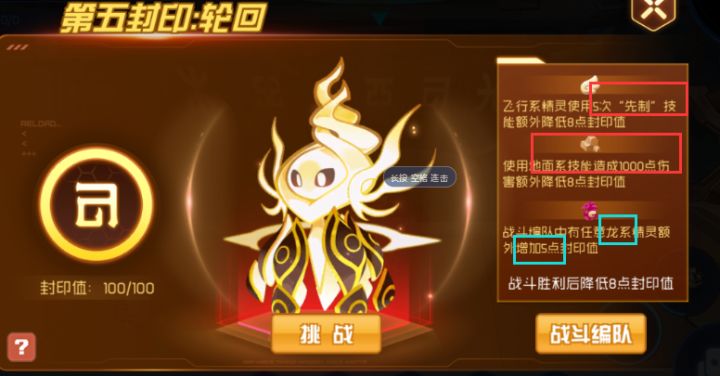 消除封印的附加条件:地面系技能伤害1000+、5次飞行系先制、不要带龙系(否则封印值+5)****特性:两条命且复活后pp也恢复**使用精灵与技能:阿葵:水之躯体(最好再多带一只冰狗或者卡修斯等耗pp的精灵防止翻车)盖亚:返璞归真、不灭斗气、大招地面系精灵、飞行系精灵(带先制技能)开局阿葵水之躯体消耗谱尼伤害技能pp地面系1000+伤害飞行系5次先制最后盖亚强化攻击+6,双防+6,大招