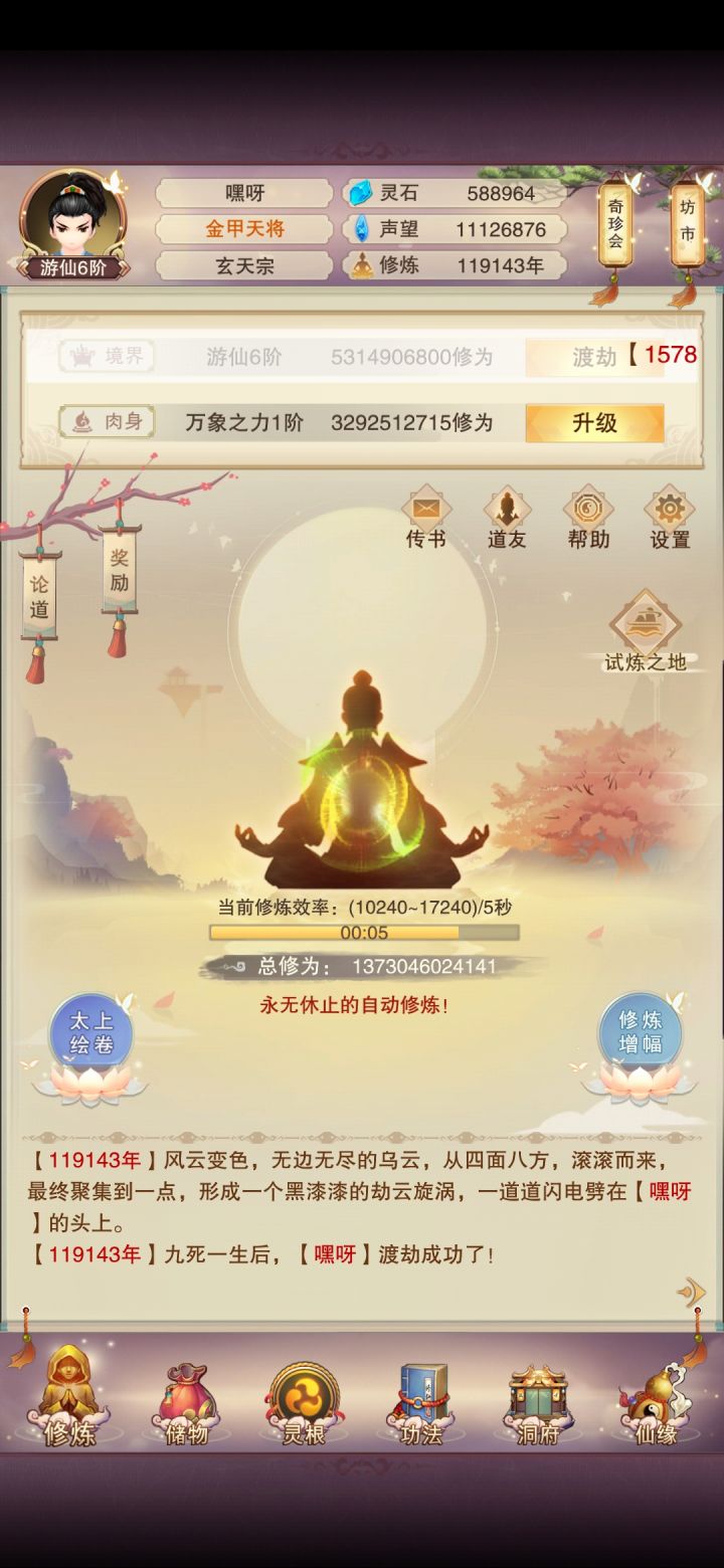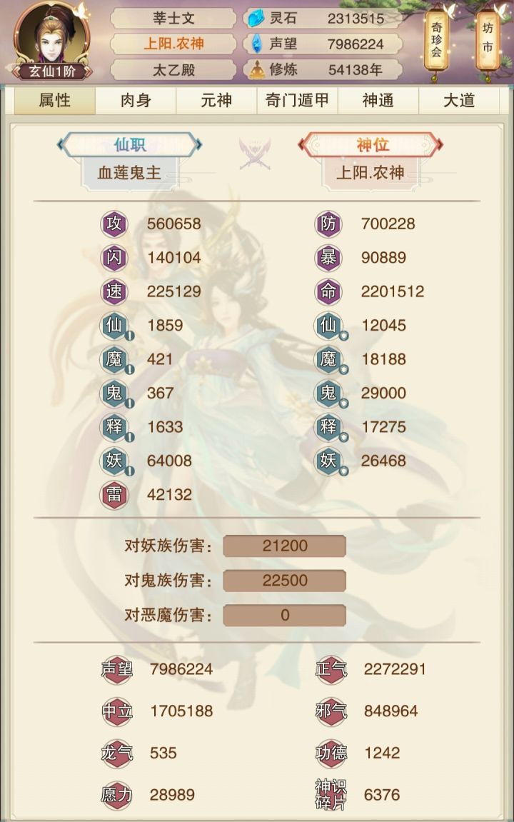 🤔🤔想来想去还是另开一贴记录下属性的增长神通的话41玄功58神决比起同期的道友少了十来本玄功,不过我还有四本玄功可以拿,等佛段时间,神识点差不多了再去凤凰蛋还可以嘛,总共开了三十颗不到就有两七星了,升三代也都是攻击型,成长也还不错(ps:我家红红最棒)天外天仙丹的话吃了两组多,有点后悔磕仙九体魄丹了最后,此贴会一直记录到我坐化
