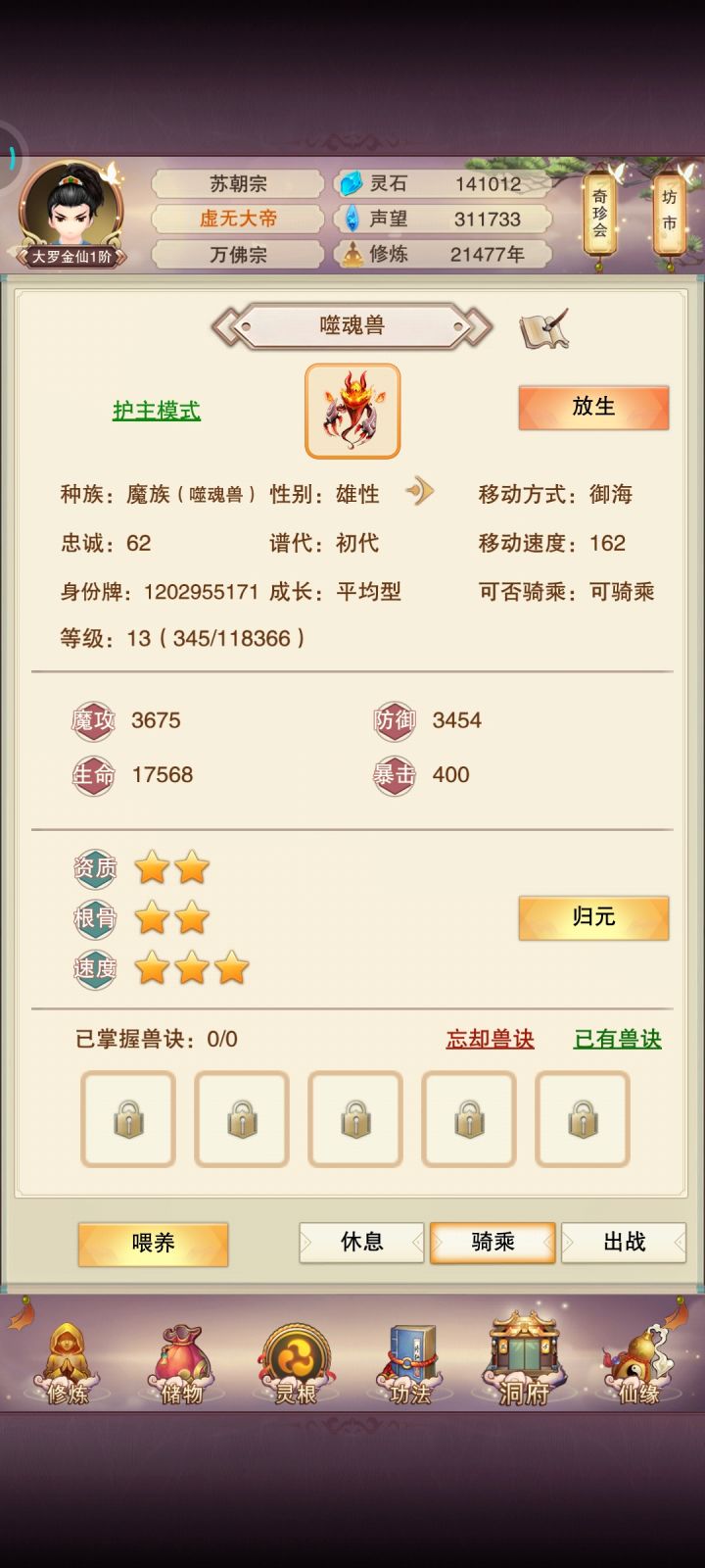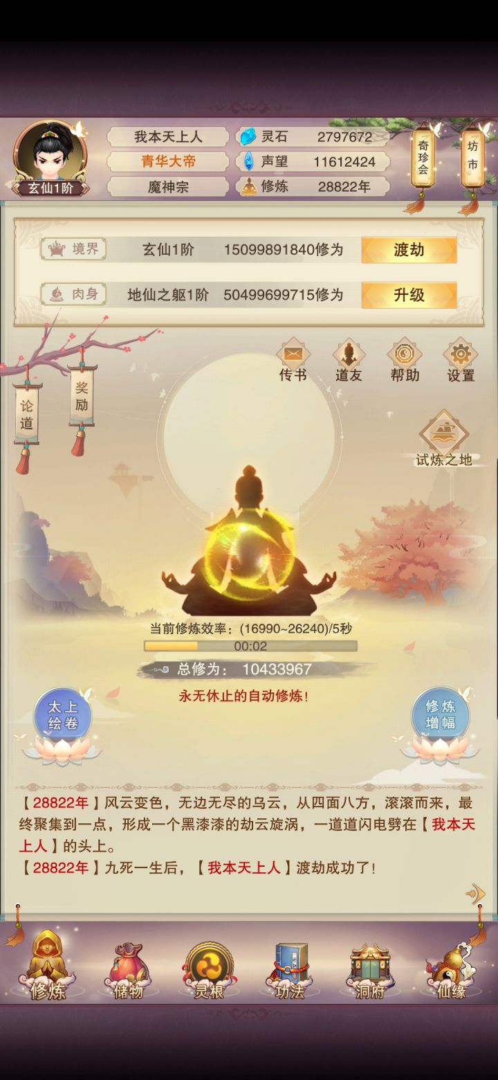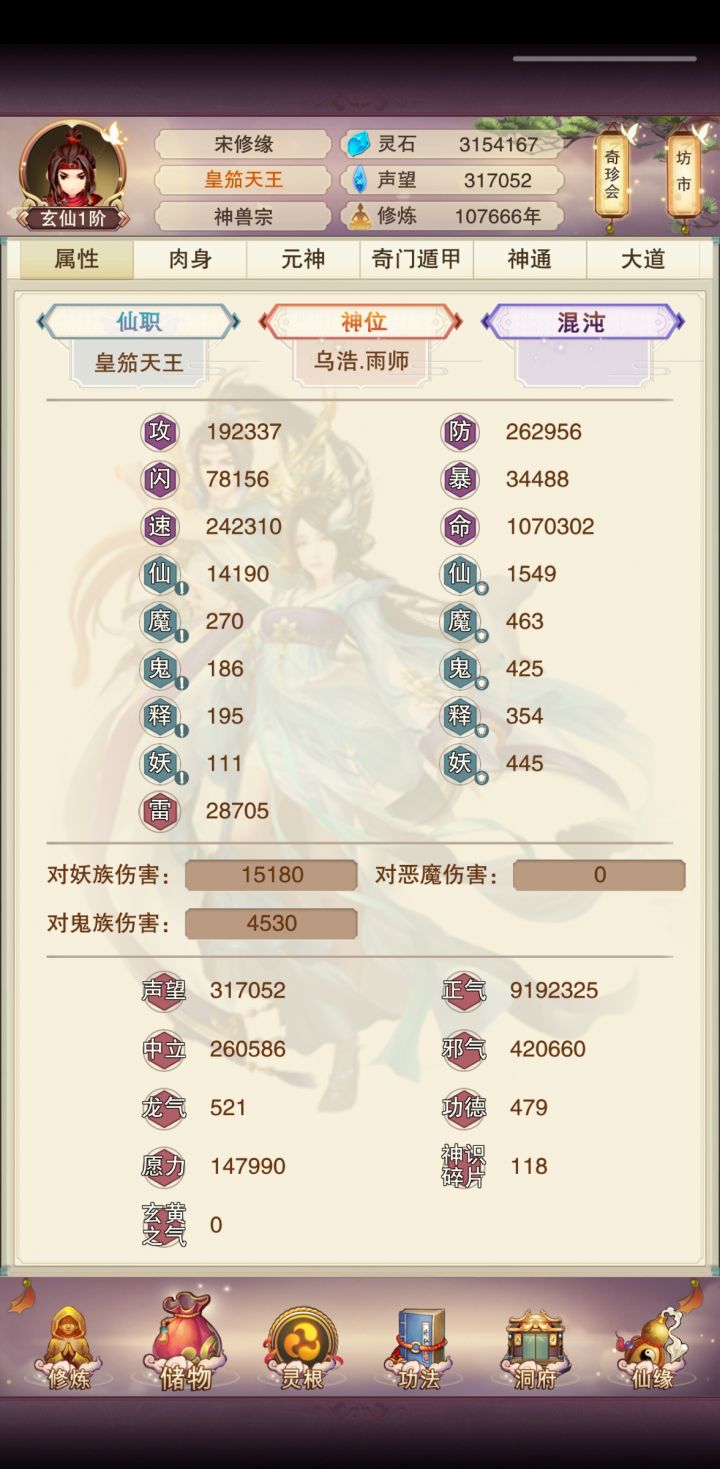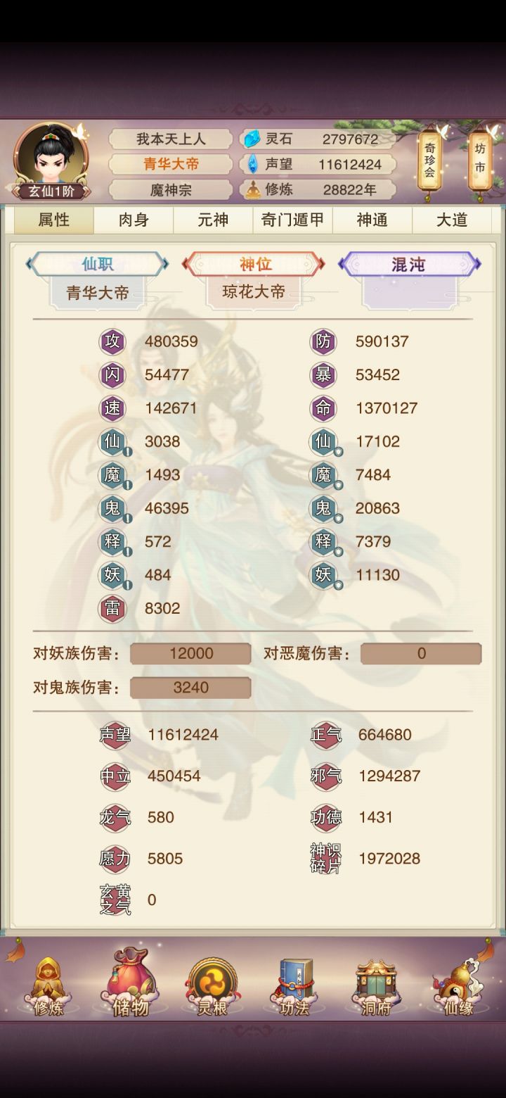 玄仙了进混沌海了发个帖子一直带的青魔,57防才开始偷神4小世界,毫无压力。元神在玄仙前一天到了100,灵髓刚好3800多第二化身估计得等几天,材料用来升升混沌之力再说。进了混沌海也开始稍微有意思点了。