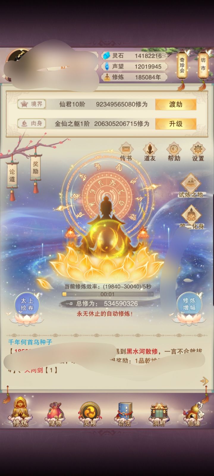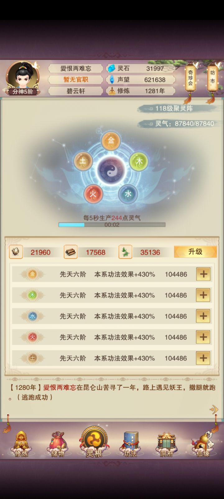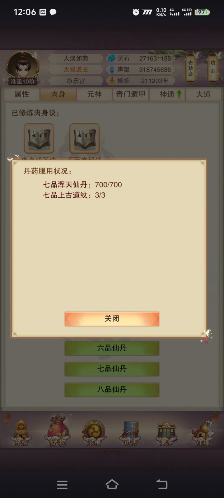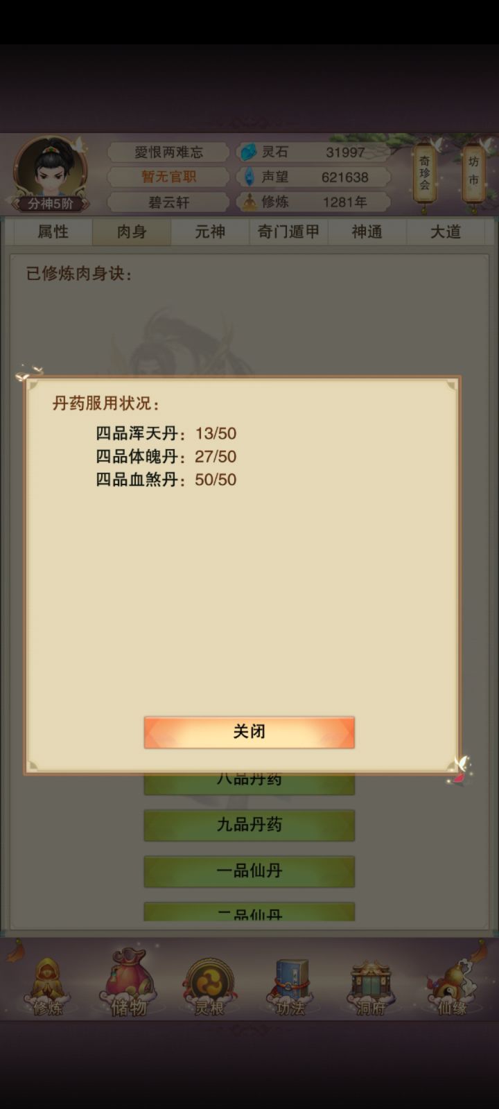 11/8 修真第十四天!!修为升了一级到分神五,越来越慢了。聚灵阵升到了118,在明天0点之前应该能到119,一天升4级,139还要一段时间。然后今天中午也是终于买到了四品体魄丹方,还是差一本六星防没刷出来,希望明天能刷吧,拿到就可以去试试图十了,早点让大佬接引上天。刷图的材料练了一些四品体魄浑天,还是缺很多,炼丹材料出现大缺口了,剩的何首乌和人参又练了一点养魂丹,一天可以刷262轮了。鬼佬明