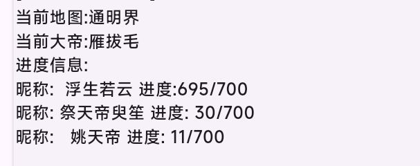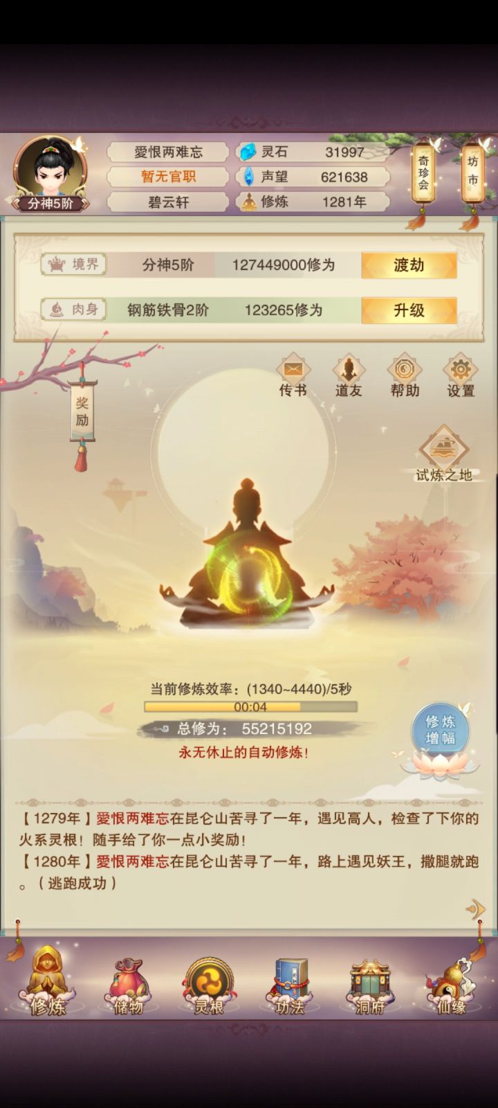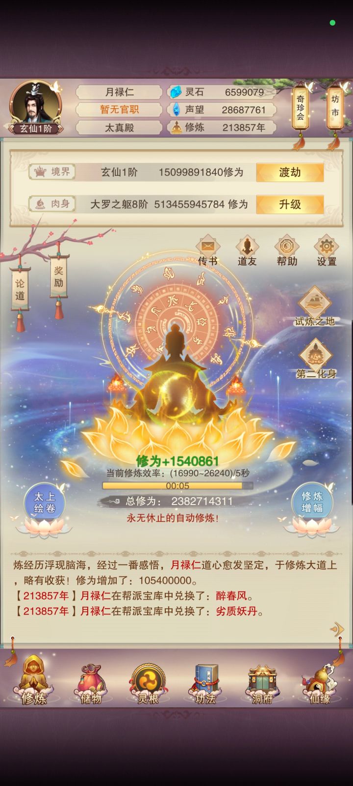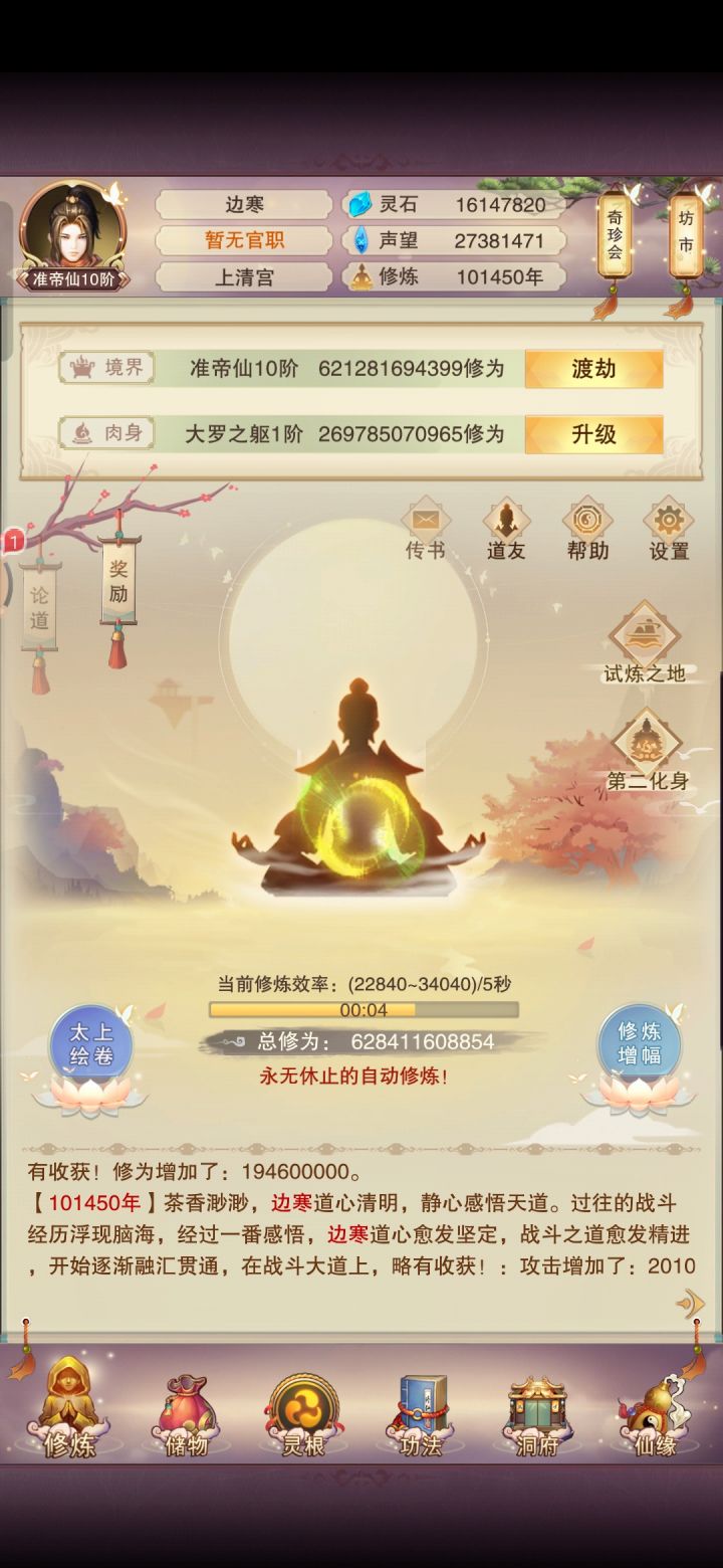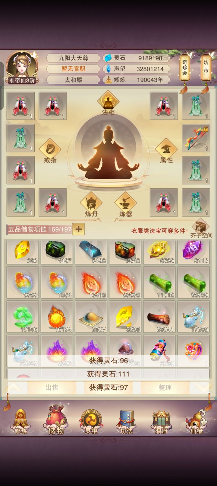 11/8 修真第十四天!!修为升了一级到分神五,越来越慢了。聚灵阵升到了118,在明天0点之前应该能到119,一天升4级,139还要一段时间。然后今天中午也是终于买到了四品体魄丹方,还是差一本六星防没刷出来,希望明天能刷吧,拿到就可以去试试图十了,早点让大佬接引上天。刷图的材料练了一些四品体魄浑天,还是缺很多,炼丹材料出现大缺口了,剩的何首乌和人参又练了一点养魂丹,一天可以刷262轮了。鬼佬明