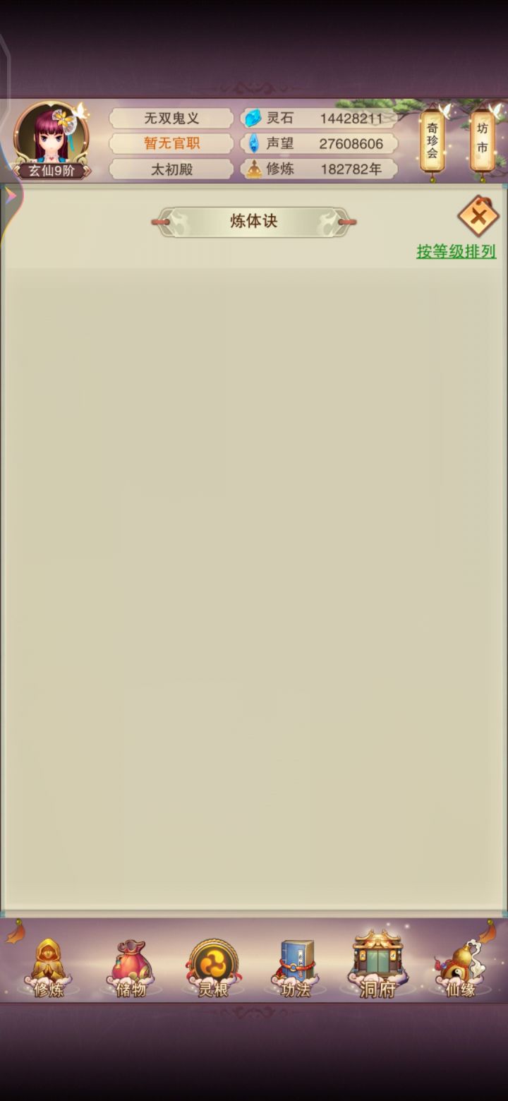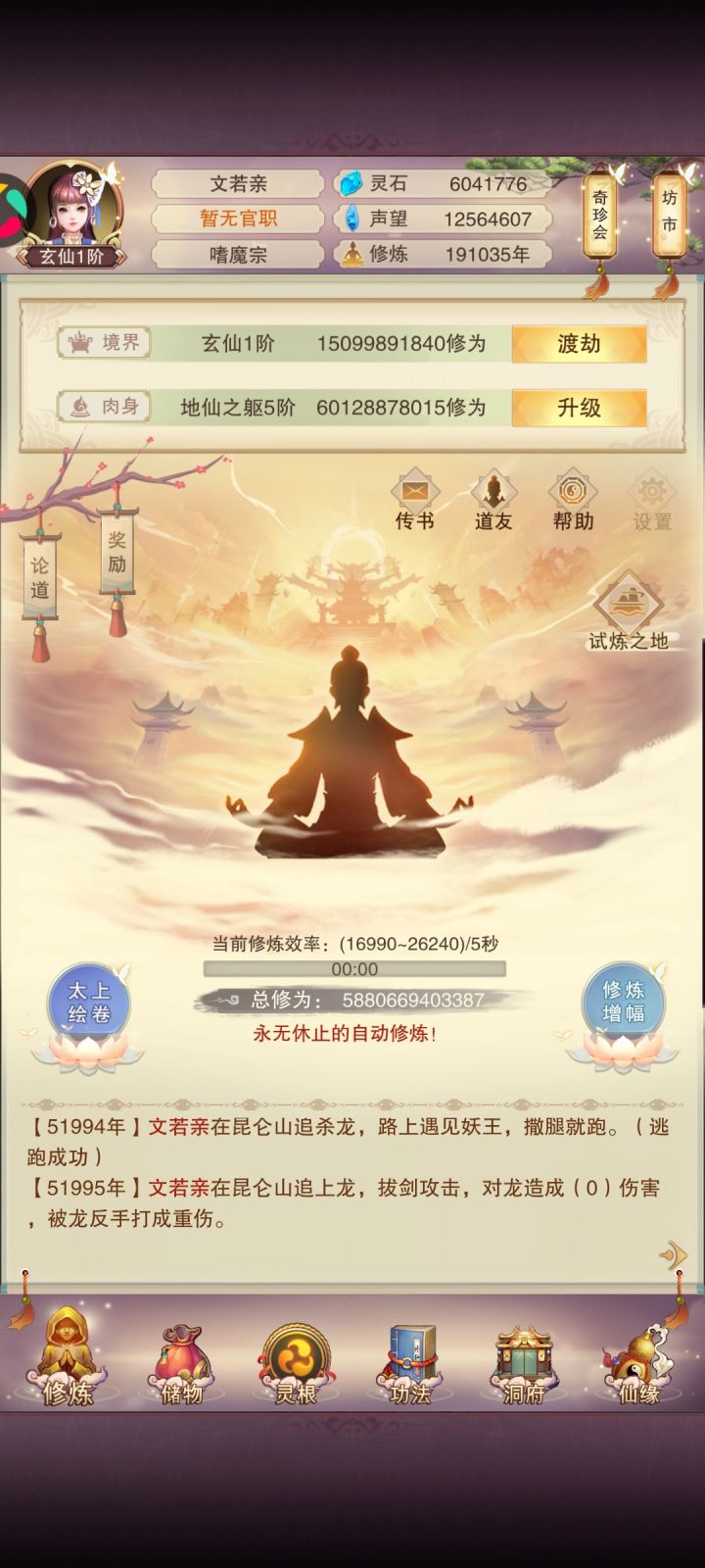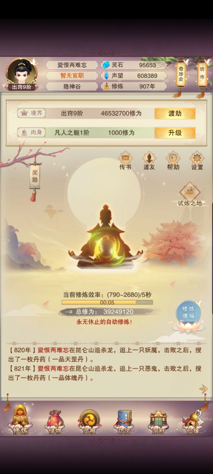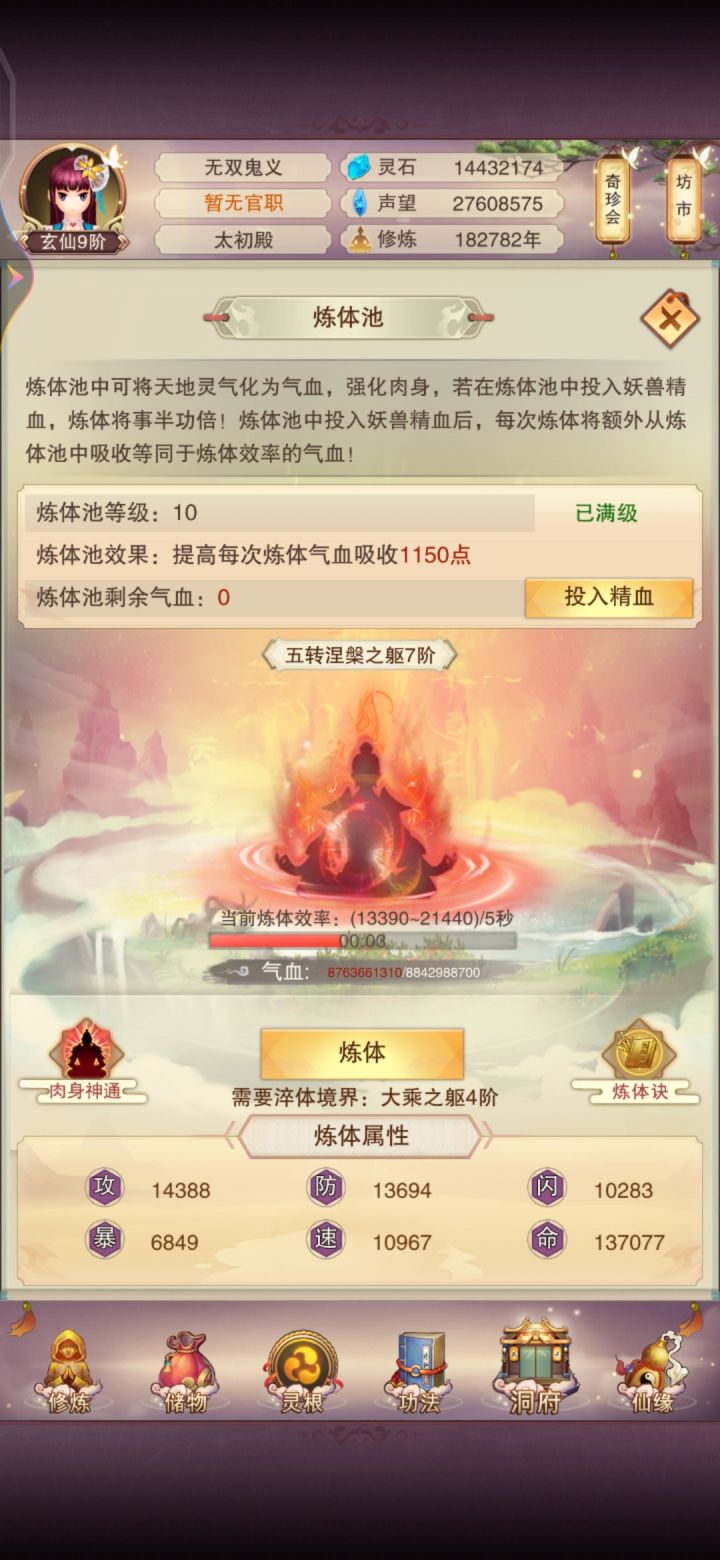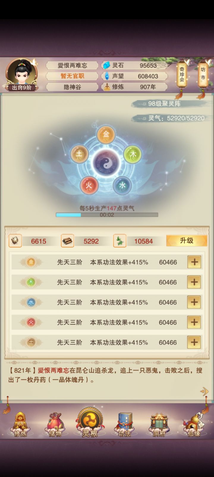 11/4 修真第十天!境界实在太难熬了,补上了青云决,修为来到了出窍9,不知道明晚上能不能进入分神,希望可以吧。刷图依旧是前七后五匡匡刷。今天书房拿到三本五星心法,还不错,还差最后一本六星防和三本五星防,39肉之后一直再升聚灵阵,感觉升级速度开始慢下来了,也不知道大家都多少年份到的139聚灵,又开始漫长的等待立志熬嘎全区道友的第十天!!