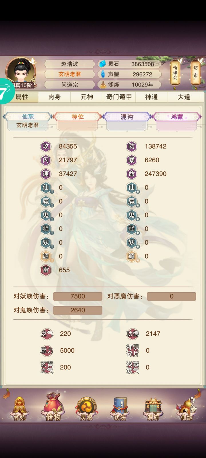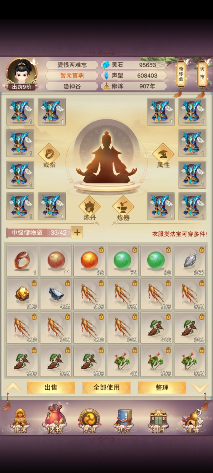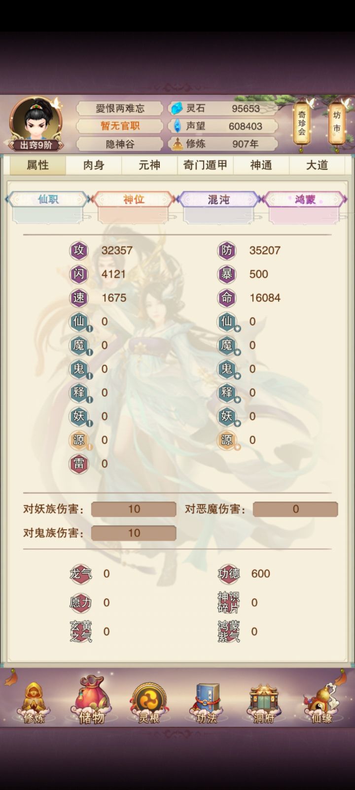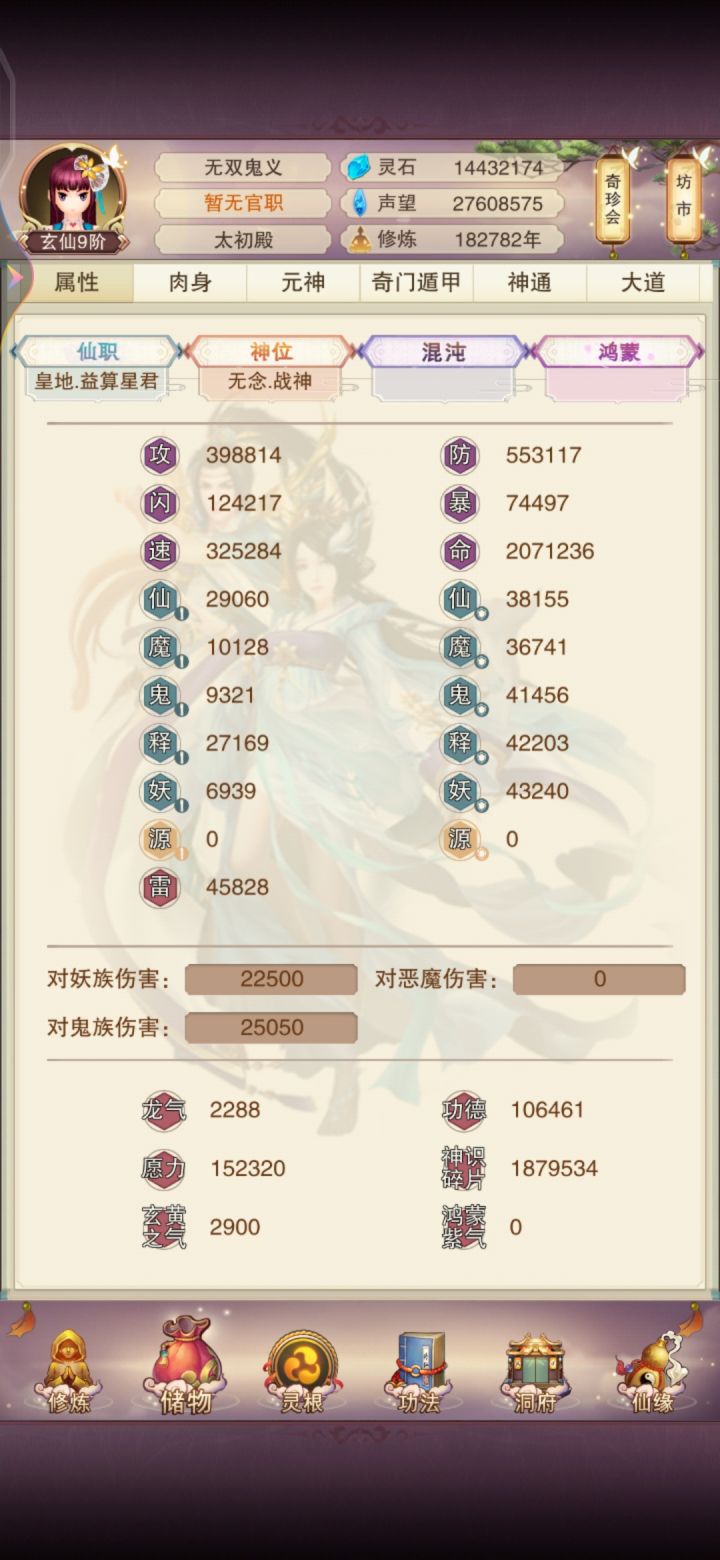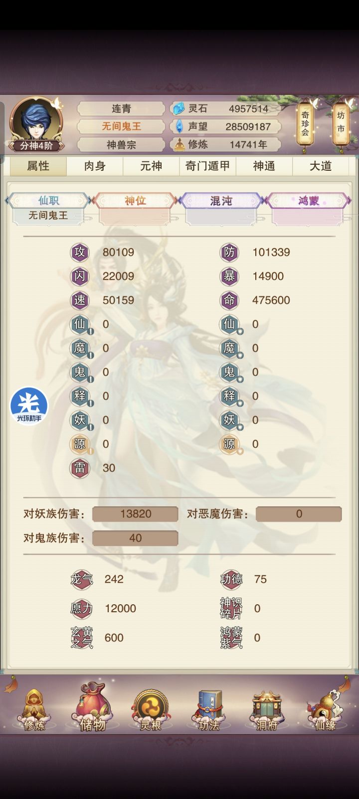 11/4 修真第十天!境界实在太难熬了,补上了青云决,修为来到了出窍9,不知道明晚上能不能进入分神,希望可以吧。刷图依旧是前七后五匡匡刷。今天书房拿到三本五星心法,还不错,还差最后一本六星防和三本五星防,39肉之后一直再升聚灵阵,感觉升级速度开始慢下来了,也不知道大家都多少年份到的139聚灵,又开始漫长的等待立志熬嘎全区道友的第十天!!