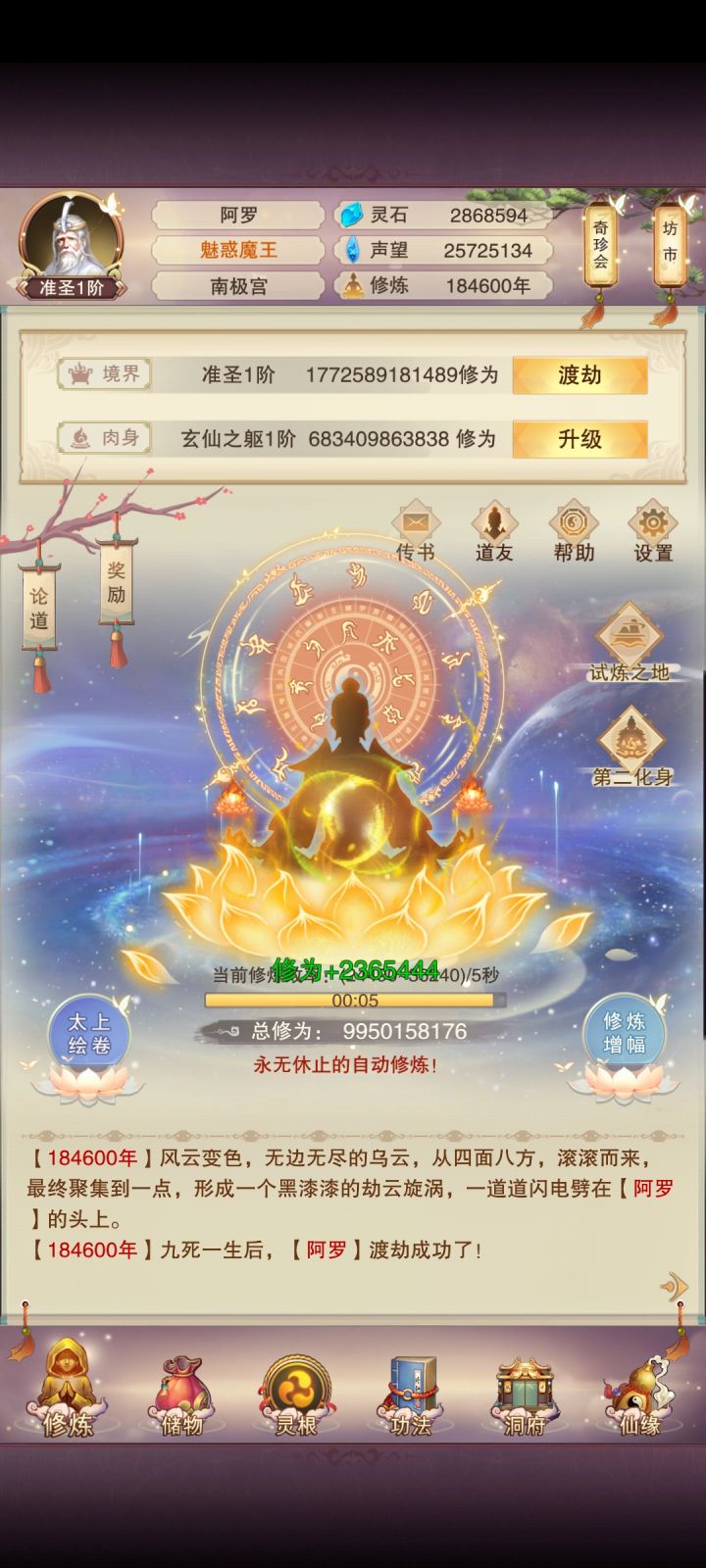 纪念一下,终于准圣了,修真路也快到头了。。因为没有三转劫丹。。。攒了好久的试炼石头,也支撑不了两次。。。😂😂😂