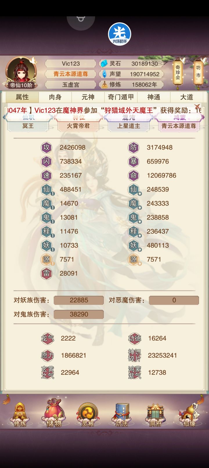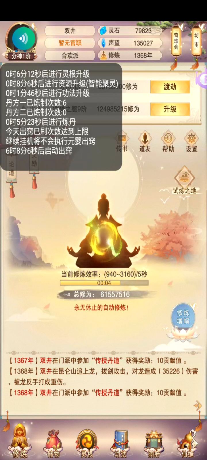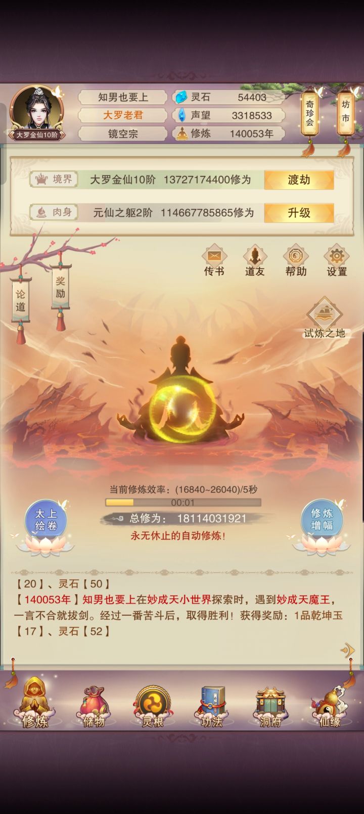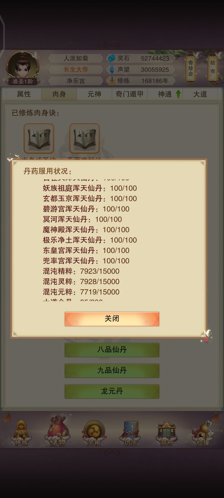 话不多说,上图目前肉身铜骨9,论道刚开第一天定个小目标,论道结束前偷过图十,上天把10个白妖丹先拿了,为以后本命做准备