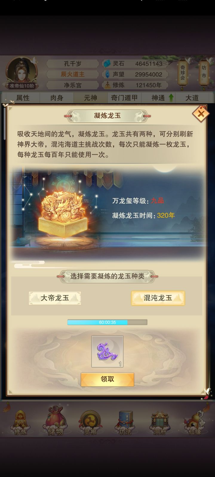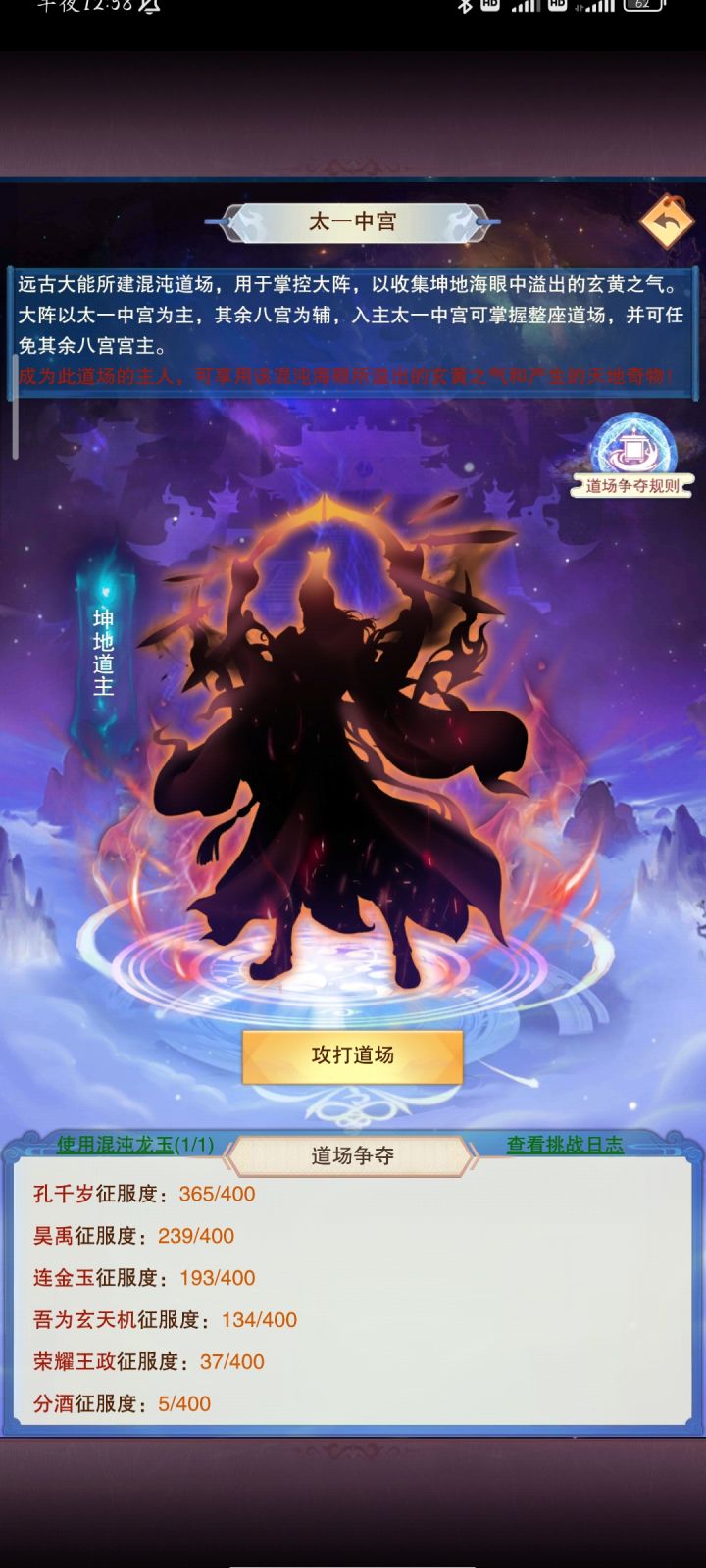 这个小禹志好像没有龙玉,因为他从来没在同一天打过我两次。本身是不打算让他吃我的道主的,只要我先他打完就行了。但是大概两万年前他在把我的赤霄帝君打下来之后,隔了几天又自己退位了,甚至界主都没了,我以为他坐化了,但这便是因果了。修道之人讲究念头通达,不沾因果。他日圆了你成为道主的心愿,你我之间便再无瓜葛。以下为记录贴,如今的赤霄帝君唤作虚衍道,杀我只需三个回合,但是他在第三天的界主进度到4