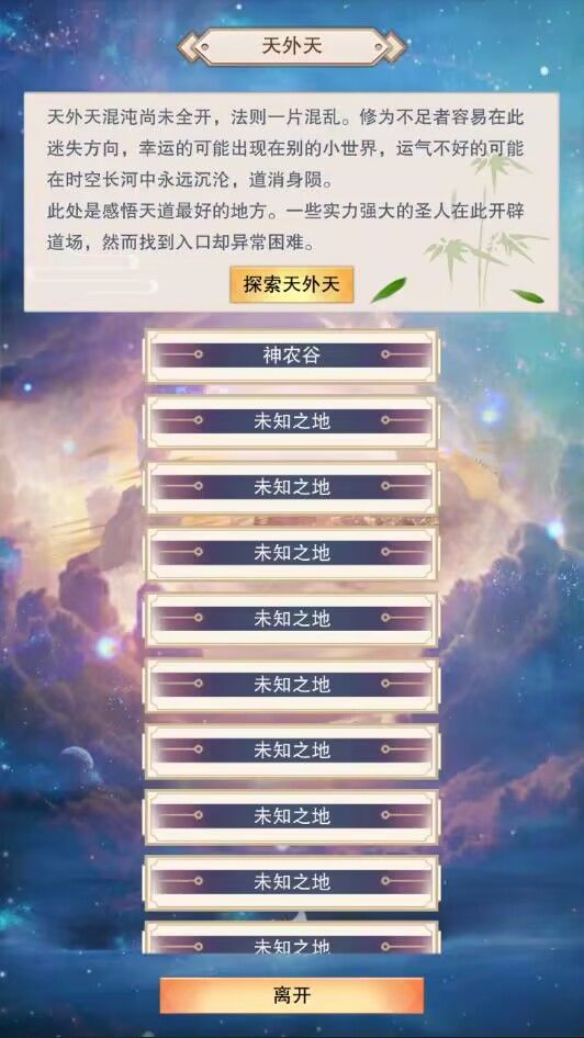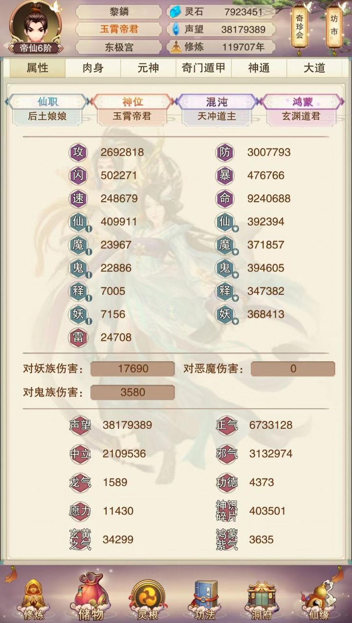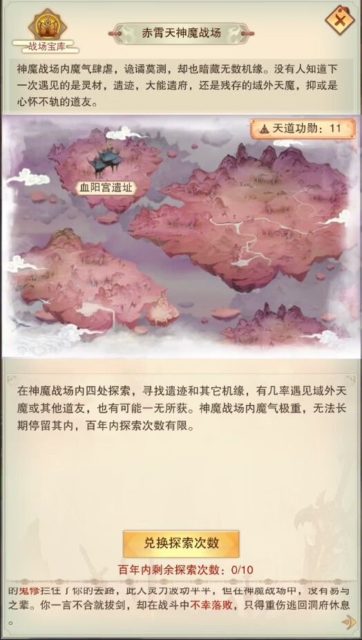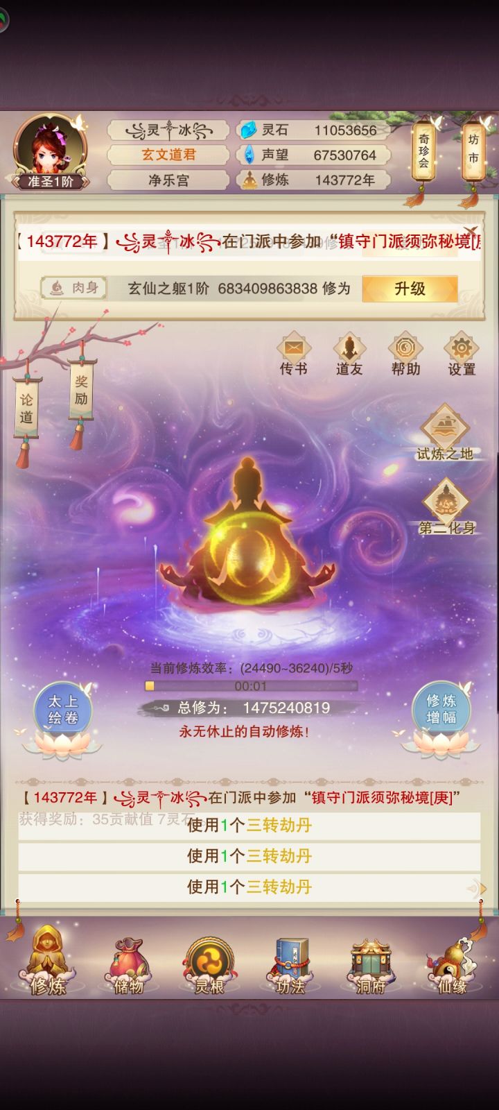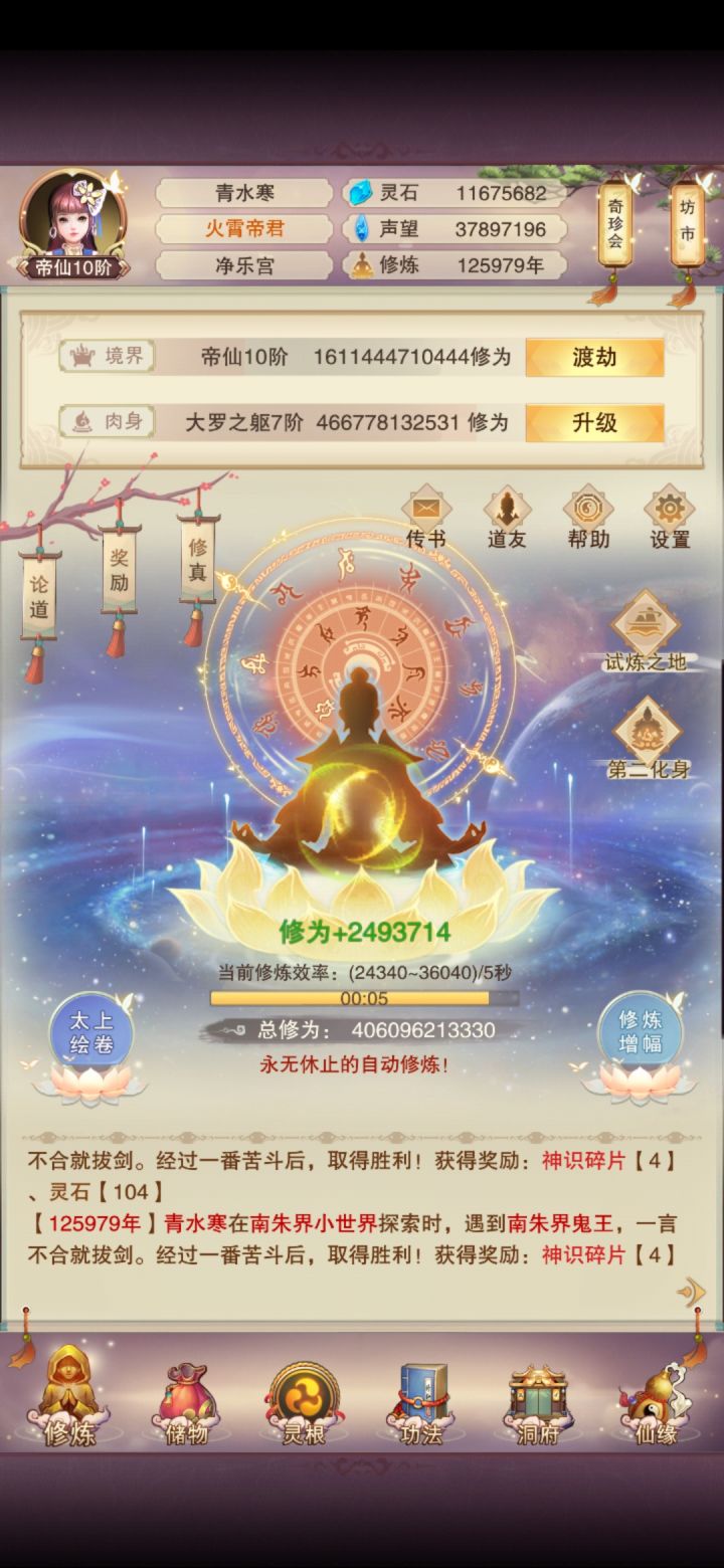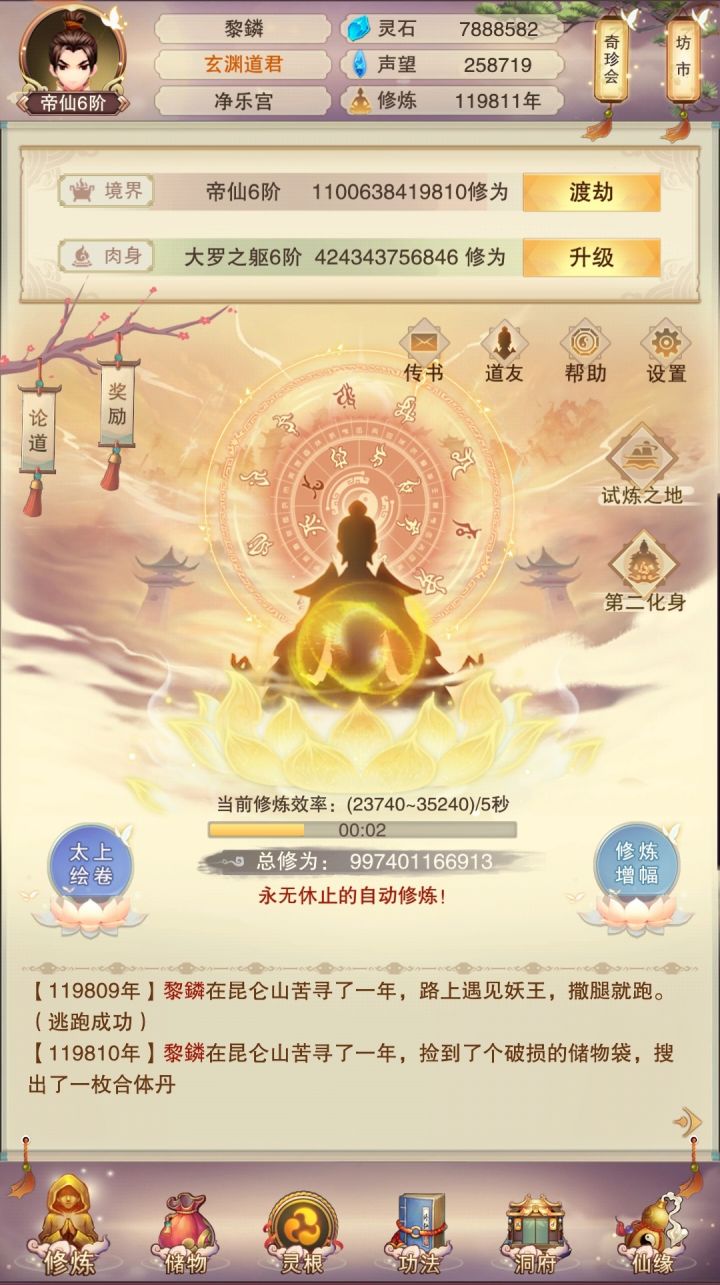 125913年前,你一介凡人因缘踏入修真界。你天赋惊人,修真1年就渡过天劫,成功筑基,开始了永无止境的修真之旅。你进境飞速,于4年结出金丹。又于38年凝出元婴,终于从万千修者中脱颖而出,在修真界有了自己的一席之地!初入修真界,你对一切都充满好奇,这是段热血激荡的岁月,你会为了修行资源频繁出入名山福地寻觅仙缘,地肺山的妖王看到了你的努力,魔王知道你的坚持。你也坚信苦心人天不负,将来自己必定能成为一