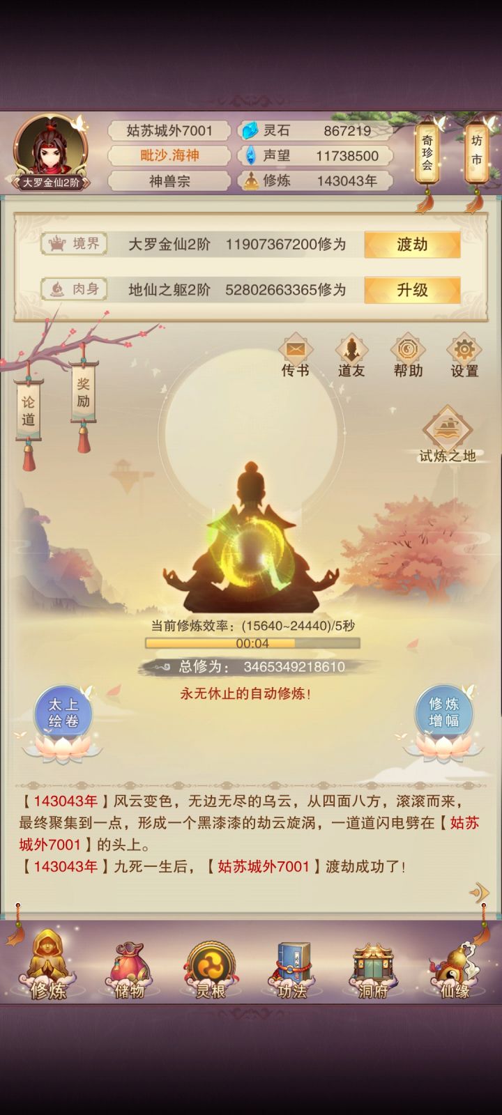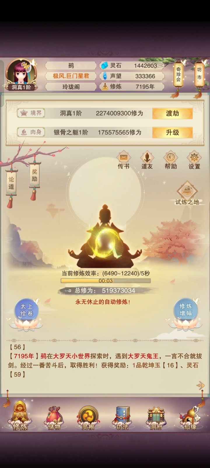 嗨嗨嗨,116老实人又出现了道浩历7195年,我历经磨难突破洞真,不得不说现在的节奏是真快啊,7000年就洞真了,想当年老区七千年还在大乘摸爬滚打,虽然现在节奏变快修真世界功能也变多了,但修真世界注定是一个烂尾游戏了,大家所有的意见全部都会被送到凡人传说策划组,可以说修真世界已经不太可能有新功能了打死我也不会去隔壁凡人传说。算了鬼佬的世界我这种咸鱼不懂。同年,我也是终于凑齐了玄武仙衣,真是忒不