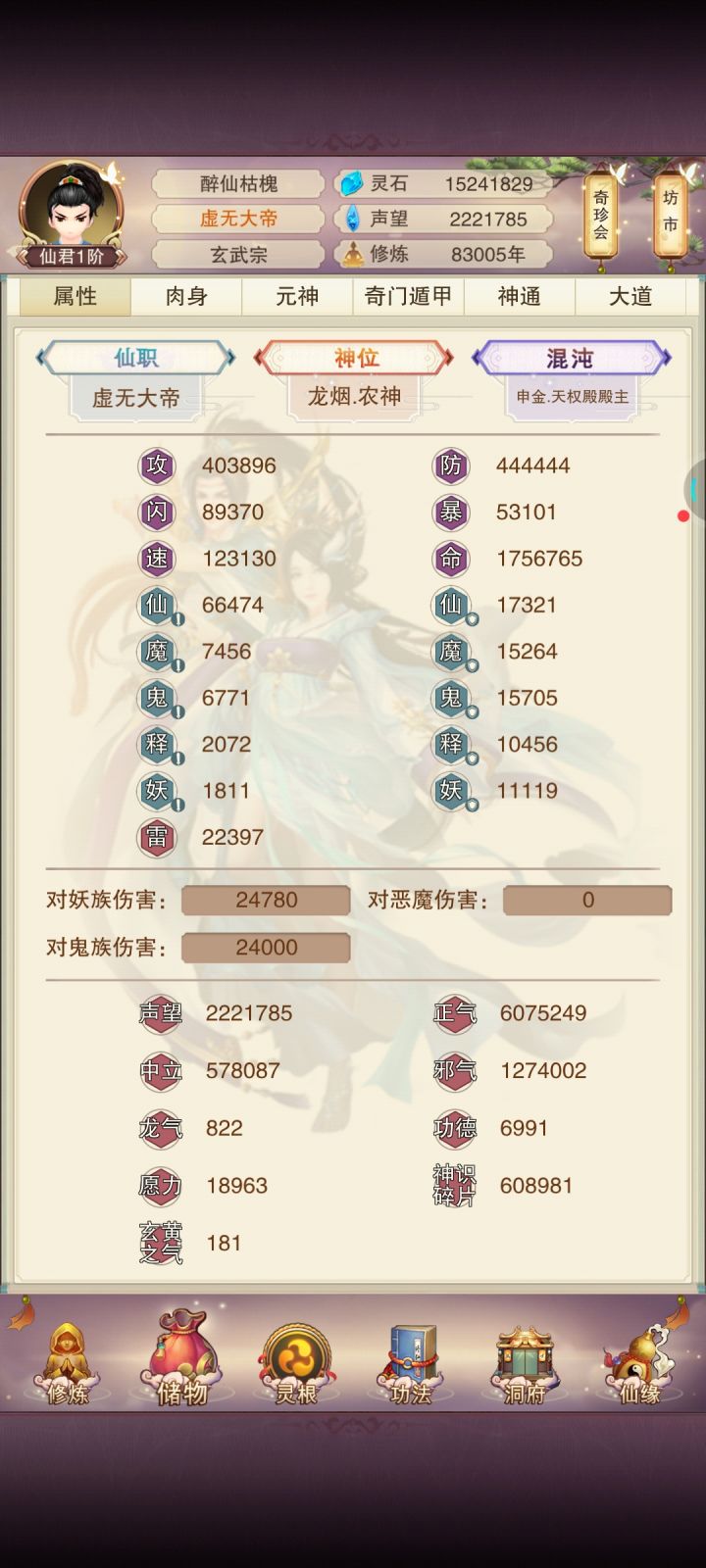 乐,这防御:444444间断坐化过几次,反正瞎玩;另,刷了2000轮东极,愣是没出一个袍子,结合这个防御,大概是我强撸上英下海把脸整黑了吧……