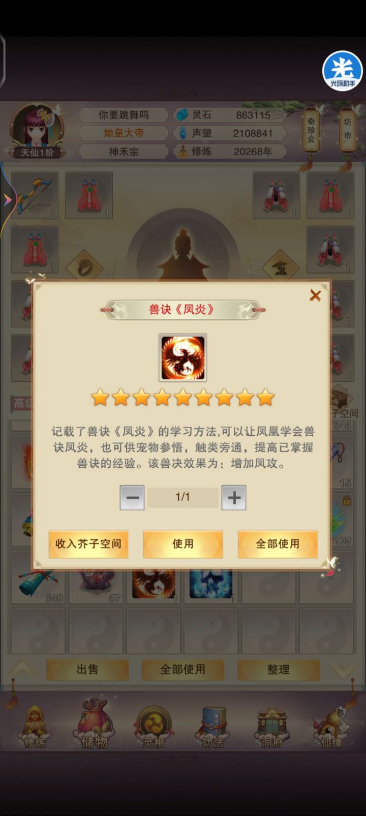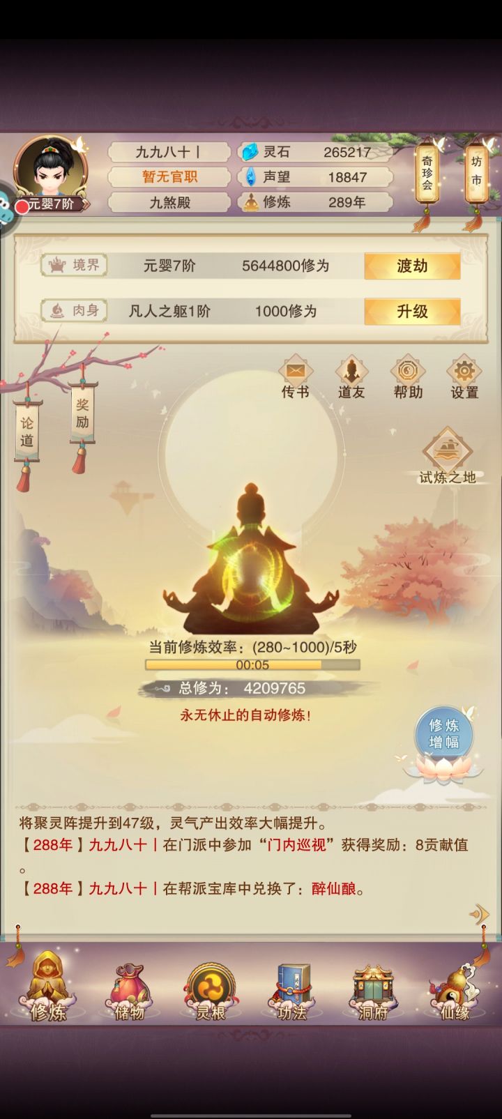 修真288年了,还没过图五,预测明天出窍,真传弟子,炼器,还想升个完美一介,这不都凑巧赶一天了。等挂完炼器再去刷剩下的技能吧!