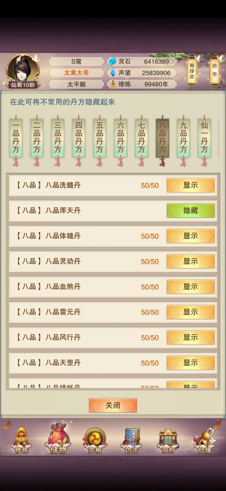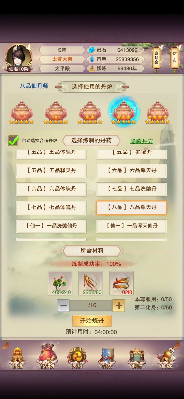 八品浑天丹,什么时候来的,今个一翻背包才发现,好兴奋啊,太平宗门挂炼丹5万载,九品洗髓八品浑天都得到了