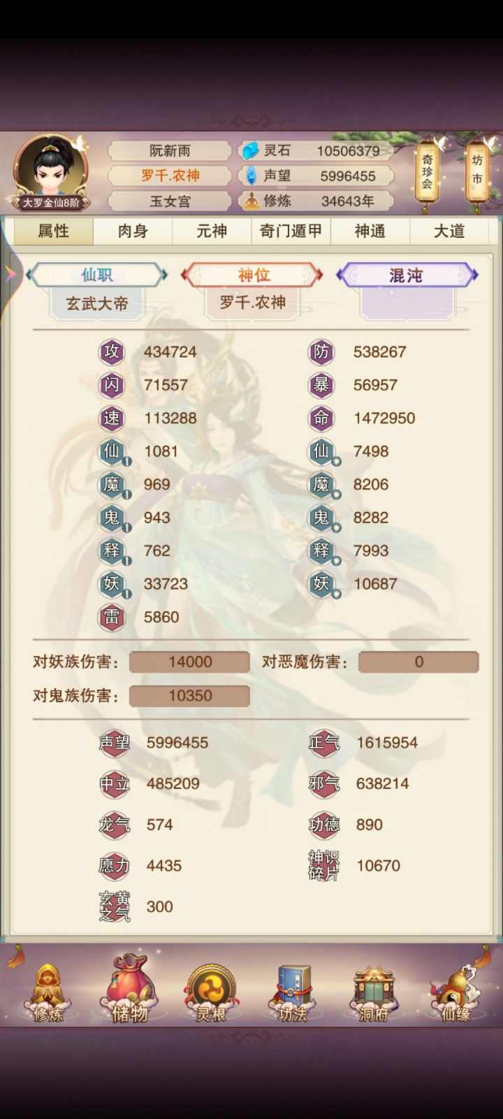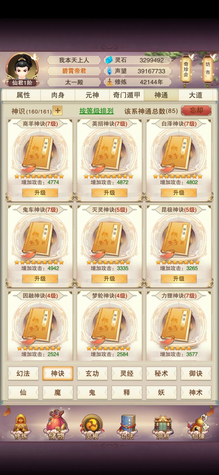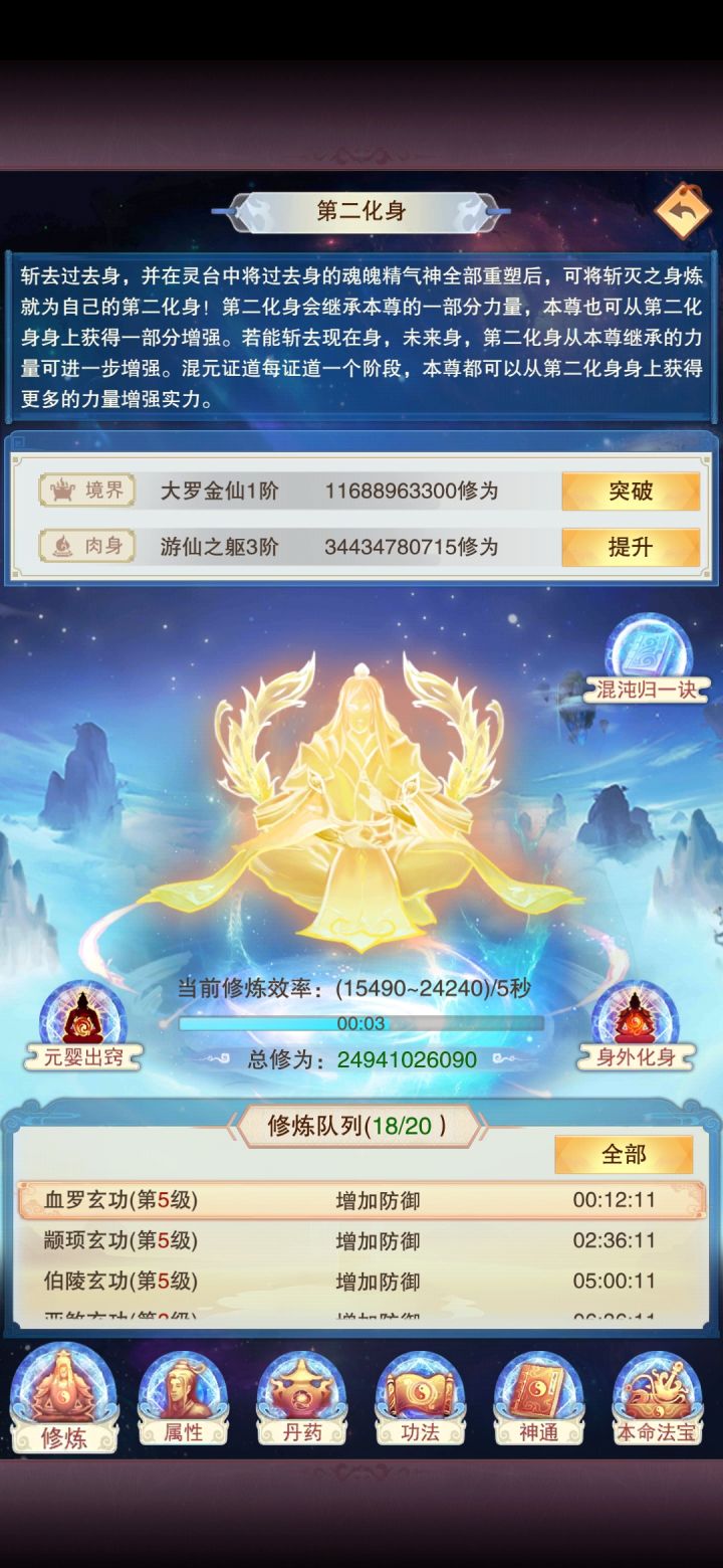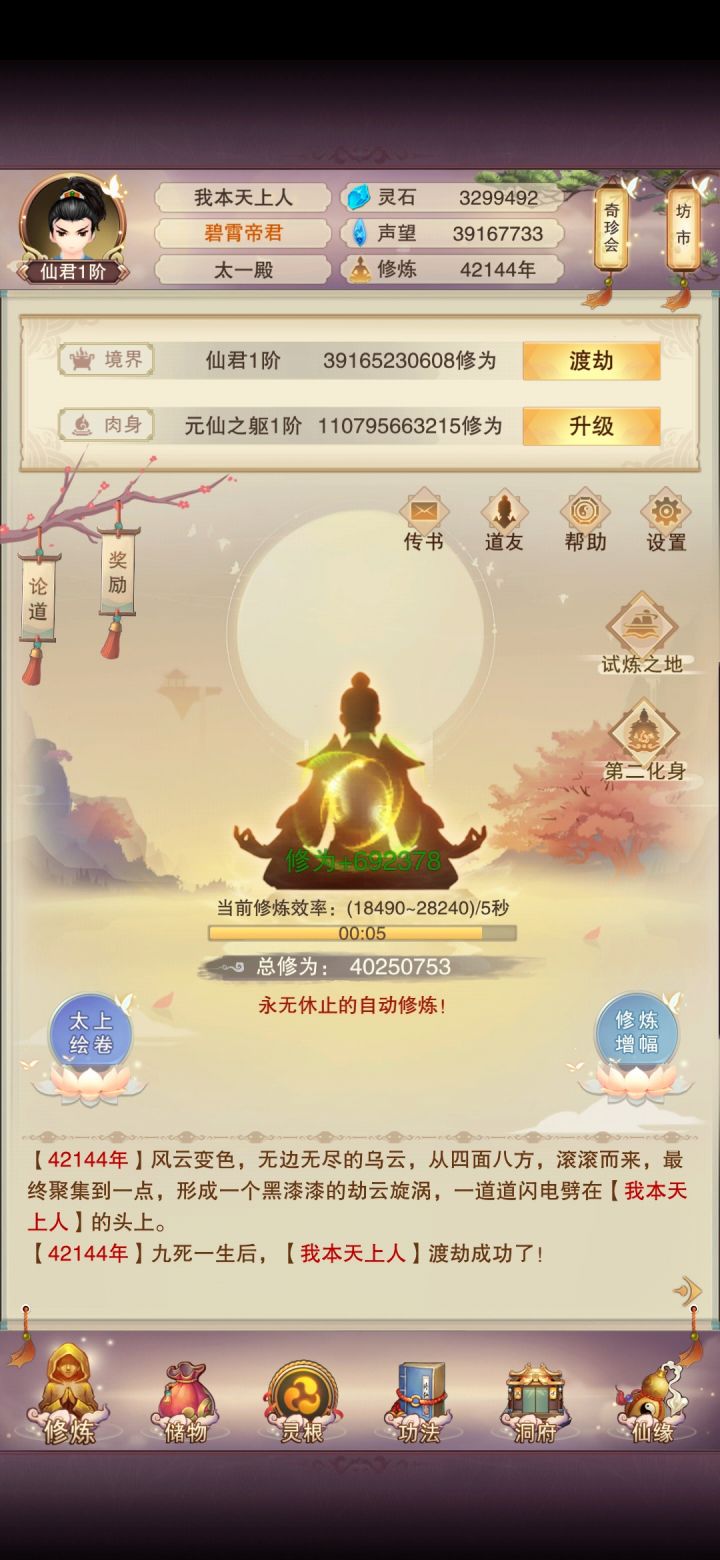 仙君了再发个帖子玄仙之后都在补天秘,现在69一跳了,339之前应该可以百万防御,门派在挂阵法,玄仙门派还有一个没进,隐世进了两个六星,人间道也快圆满了,望仙楼90没去偷但是也快了,混沌海道图一层加二层的一副,补的晚所以混沌之力不高,攻击神通5-7没氪,不过有一说一,神识碎片真的缺,我把4星以下真伤真防全忘了都不够。等仙尊了再来发个帖子,不知道能多少防御