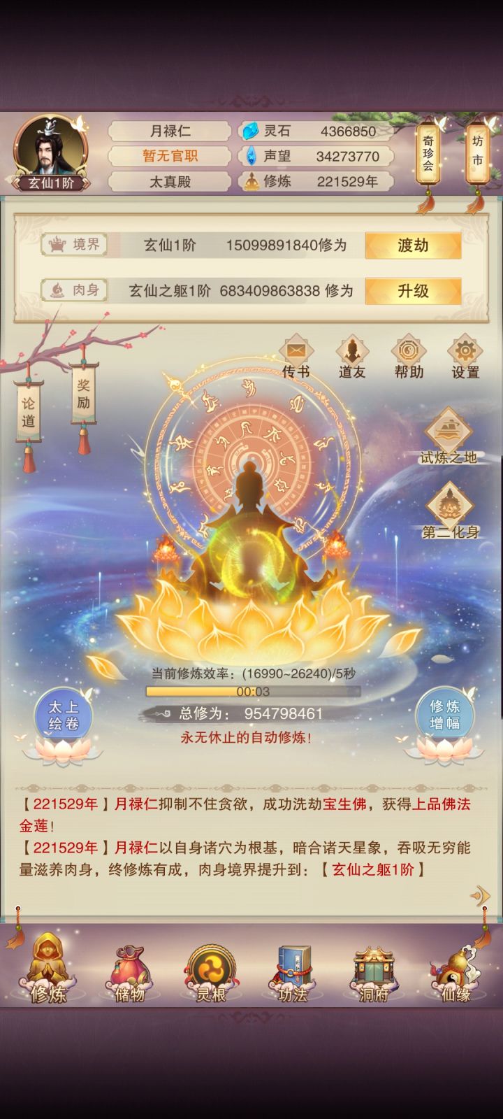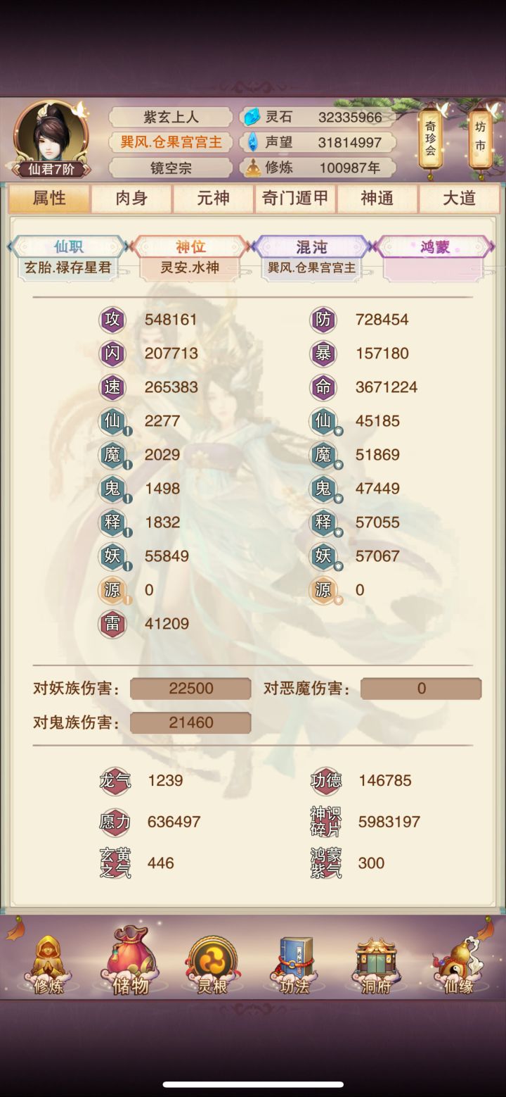 #游戏日常 5300年记录:1.今天运气不错,过了天16,美滋滋;2.可以全力搞9器炉的红蓝石头了;3.大乘期现在的属性,接下来还能做什么?
