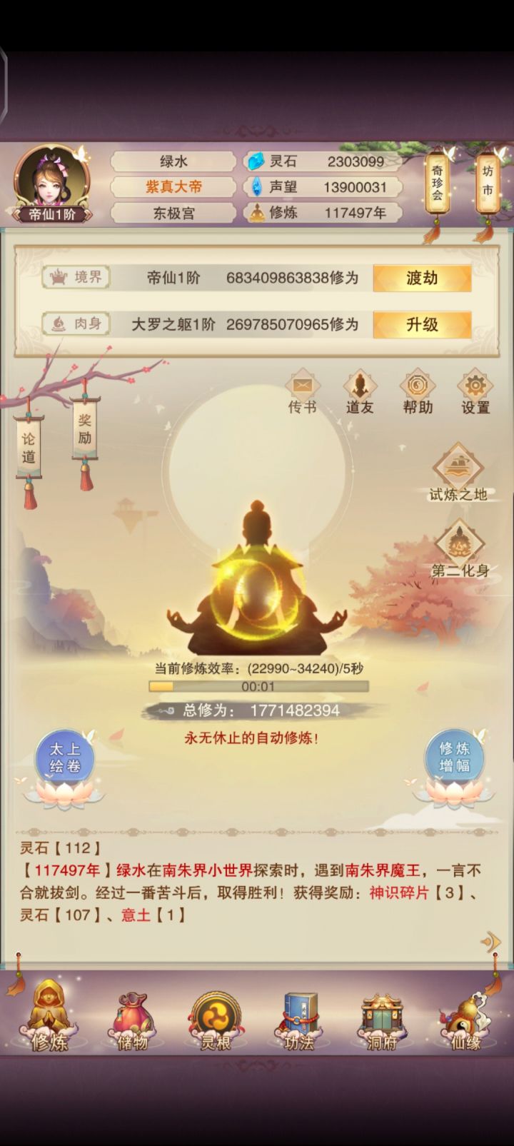 承天历6200年,周日,晴!临时起意,想要记录一下修真路上的节点,早期的一些截图都没保留~不过想来应该也没人会看到这个帖子也就无所谓了 目前的计划帖子记录的内容包括:1、个人的修真节点:大境界升级年限、过关键地图(包括功德任务、功德车)的属性、洗髓与聚灵节点、装备到手的年限、养魂逢50的节点、各🌟门派秘籍毕业节点、门派升🌟时的技能点准备;2、大乘之后解锁的各玩法记录;3、承天界趣事。