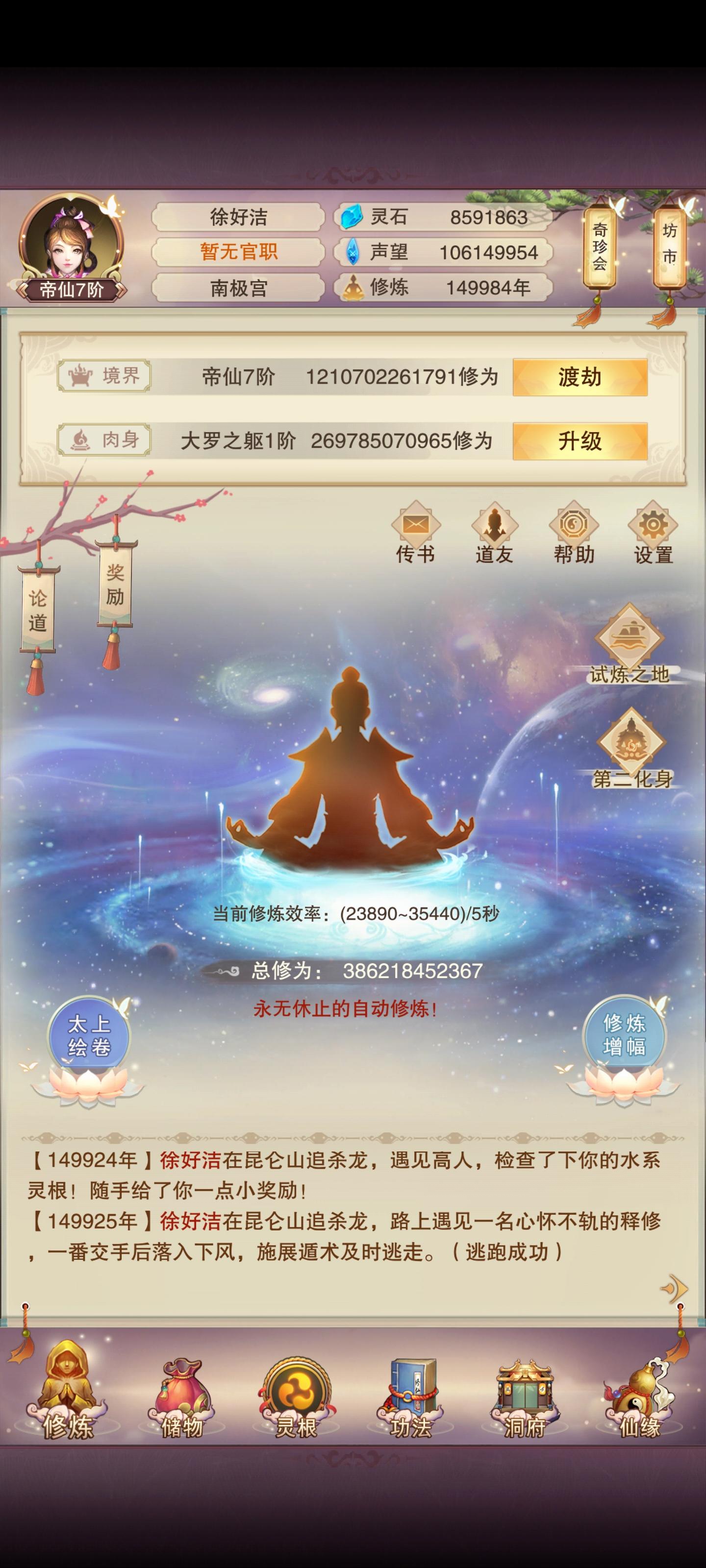 建议这个修炼剪影能不能也换换,就是不同修为可以获得不同剪影,然后可以稍微加点属性啥的。还有宠物界面也可以加宠物剪影。如果本人有界主,修炼剪影和宠物剪影可以在界主界面显示等等。总之一句话,就是加强游戏的观赏度。