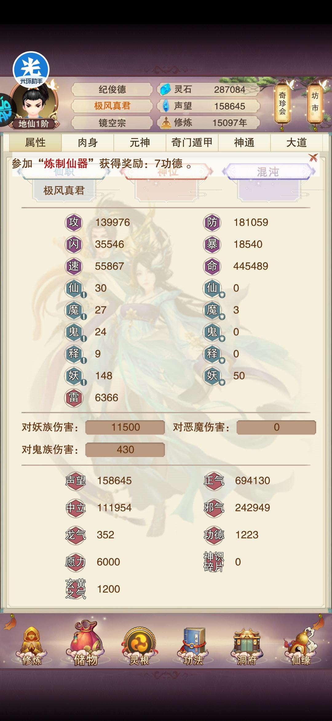 魔神界闪概率太小了,要不要练灭魂。还有一星期左右能228,攻防各加30000也不能多抗一刀。