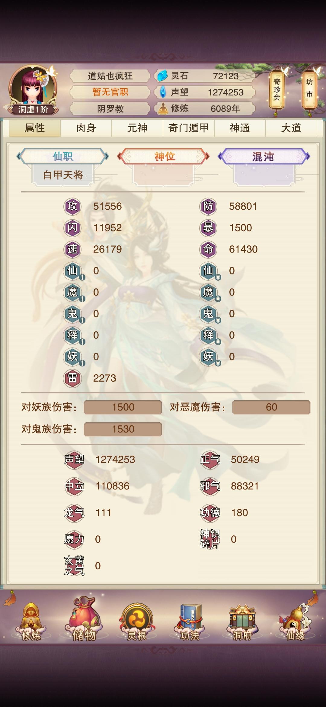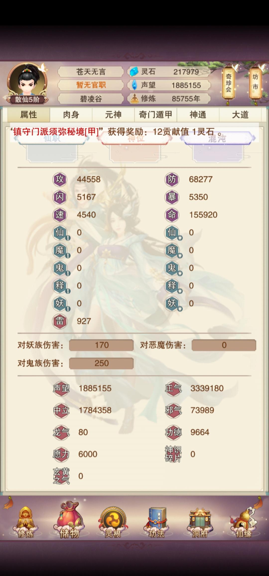 一年多没玩儿了,然后最近才开始继续玩儿,这个防御我看的都有点难搞,别人大乘都7.5w多了我散仙才这么点,这号是不是废了