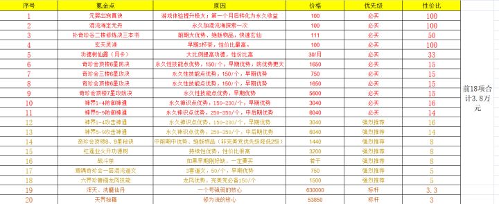鉴于版本更新,氪金点优先度进行总结,便于各位小中大巨佬氪金方向选择。9800左右可以买完门派技能,秘籍买鬼王+除去玄天外的9星秘籍1170,一楼6本书222,出窍100,九星炼器炉300,789丹方360,防御神通1-9星9600左右,还有2000需要你买混沌海的茶,出窍丹,1楼3套道图。这样差不多要花23552元,3.5万克是多买攻击神通。这个属性无敌只比大佬差在仙丹,境界升级也在第二梯队,只