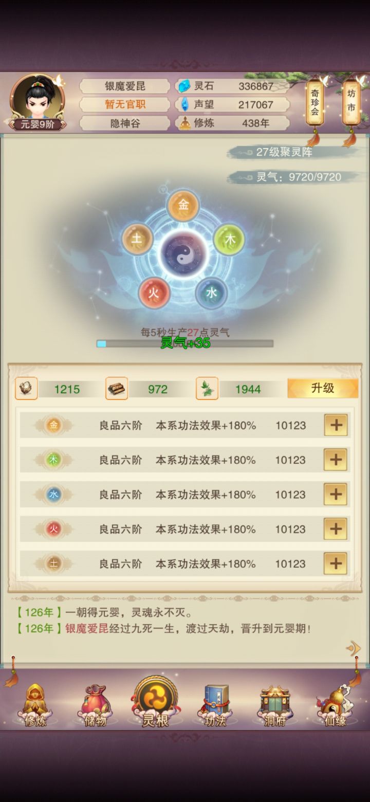 往期回顾:下期弹幕:境界解锁:神魔战场、选修职业、练体池、玄武宗、轮回殿、一路向北、神界神通、六星福地、天外天门派:解锁九星玄武宗,青云门概率增加门派秘籍刷完后,找个炼丹养养老淬体:有灵液就淬温馨提示:每每天都偷一下四极天的功德11哟神界之门:境界压制取消所以大部分一般都是地仙才过提示:把速度堆到10万可以先手偷图:偷图偷到神界地图神一(赤霄天)图八(乌浩界)(前提扛